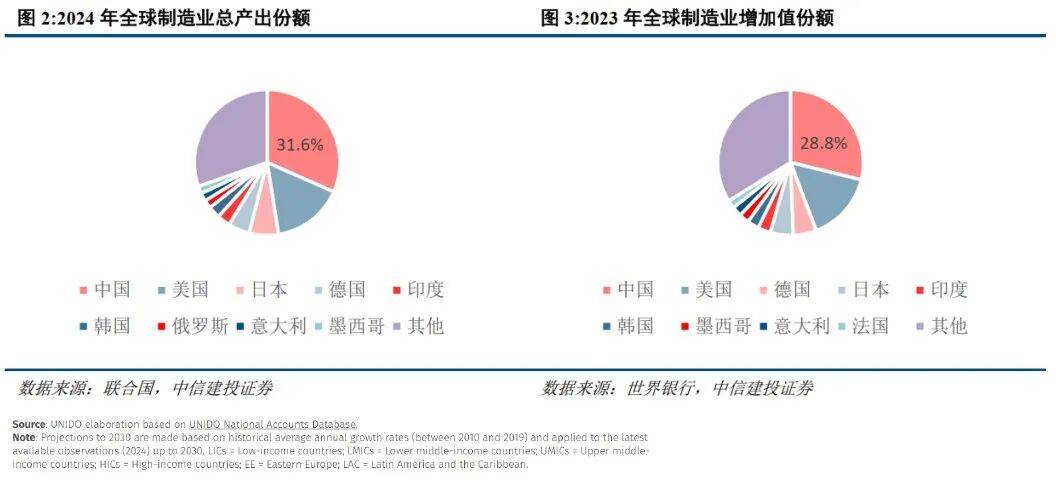 宏观经济总体表现 - 前三季度国内生产总值1015036亿元,同比增长5.2% [1] - 全国规模以上工业增加值同比增长6.2% [1] 中国制造业全球规模与地位 - 制造业增加值从2020年的26.6万亿元增长至2024年的33.6万亿元,“十四五”期间增量达8万亿元,对全球制造业增长贡献率超过30% [2] - 中国制造业增加值占全球比重接近30%,总体规模连续15年保持全球第一 [2] - 中国制造业增加值在2010年超过美国,全球占比从约19.4%上升至目前接近30% [3] - 按产值计算,中国制造业2024年全球份额为31.6%;按增加值计算,2023年份额为28.8% [4] - 联合国工业发展组织报告预测,中国工业增加值占全球比例将从2000年的6%升至2030年的45% [6] - 中国发电量约10.1万亿度,占全球总量的32.3%,高于第二至第五名国家之和 [9] 重点制造业行业产出与贸易 - 2024年中国汽车产量3128万辆,占全球33.8%;出口641万辆,出口额1171亿美元,实现贸易顺差739亿美元 [10] - 2024年中国芯片产量约4250亿颗,全球占比约35%;等效8英寸晶圆产能全球占比约29%,但芯片贸易逆差巨大,2024年达2261亿美元 [11][12] - 2024年中国服装出口额1591亿美元,全球占比约30.7%;年产服装700多亿件,内销占比高达70% [12] - 大部分大类制造业行业产出以数量计全球占比达50%以上,以产值、增加值计也在30%以上 [13] 制造业出口结构与顺差 - 2024年制造业产值94万亿元,出口25.45万亿元,出口额占总产值的26.6% [14] - 2024年中国出口额(含服务)占GDP的比例为26%,与美国、日本相当,远低于欧洲国家 [14] - 2025年前8月,中国货物贸易顺差7853.4亿美元,全年预计突破1.2万亿美元,占全球GDP的1% [17] - 2025年前8月,对印度贸易逆差690亿美元,对越南贸易逆差759亿美元 [18] 人民币国际化进展 - 2024年货物贸易中人民币跨境收支占比约30% [29] - CIPS处理金额从2020年的45万亿元人民币增长至2024年的175万亿元,年均增长40% [32] - 截至2025年6月,CIPS直参行突破170家,覆盖186个国家和地区,与SWIFT重叠率降至30%左右 [32] 国内制造业产能与竞争态势 - 众多行业生产能力充足,需求见顶现象出现,例如白酒行业需求自2016年见顶后至2024年大幅下滑70% [44] - 供给弹性极高,企业为抢占市场份额不惜亏损扩产,导致PPI连续35个月为负,2025年8月同比下降2.9% [45][49] - 行业内部“内卷”加剧,表现为激烈的降本增效和价格竞争,国家市场监管总局已对光伏、汽车等行业的不当竞争行为进行约谈和重点核查 [48][53] - 制造业就业人员约1.3亿人,全国总就业人员7.34亿人,第三产业就业人员3.59亿人,占比48.8% [56]