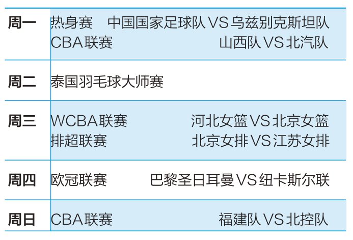 根据乌兹别克斯坦足协的官方消息,中国男足将在今天与乌兹别克斯坦国家队进行封闭热身赛。U23国 足在亚洲杯决赛上4球败于日本队,让球迷清楚地看到中国足球与亚洲顶流的差距。新一届中国男足正 在起步,更需要来自全社会的支持。本报记者 安然 上周在"京城德比"中落败的北汽男篮,本周内将继续一周三赛,分别是今天客场对山西队、周三客场对 天津队,周日主场对青岛队。从赛季之初的高歌猛进到现在的步履维艰,北汽男篮高开低走的时刻,不 仅考验球队上下,也考验着球迷们对球队的忠诚度。 北控男篮和首钢园女篮情况同样不算乐观,本周内这两支球队也将分别迎战强敌。本赛季的北京职业篮 球,正处于艰难之中。 | 居一 | | 热身赛 中国国家足球队 VS 乌兹别克斯坦队 | | --- | --- | --- | | | CBA联赛 | 山西队 VS 北汽队 | | 周二 | 泰国羽毛球大师赛 | | | 間三 | WCBA联赛 | 河北女篮VS北京女篮 | | | 排超联赛 | 北京女排 VS 江苏女排 | | 周四 | 欧冠联赛 | 巴黎圣日耳曼VS 纽卡斯尔联 | | 間日 | CBA联赛 | 福建队 VS 北控队 | ...