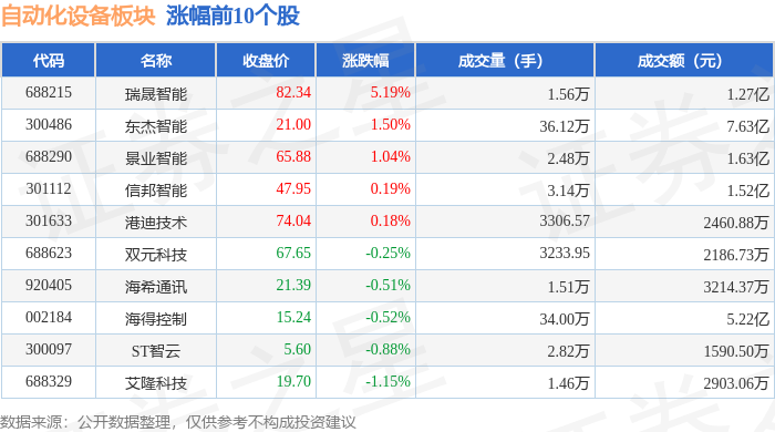 证券之星消息,10月20日自动化设备板块较上一交易日上涨1.8%,瑞晟智能领涨。当日上证指数报收于 3863.89,上涨0.63%。深证成指报收于12813.21,上涨0.98%。自动化设备板块个股涨跌见下表: | 代码 | 名称 | 收盘价 | 涨跌幅 | 成交量(手) | 成交额(元) | | | --- | --- | --- | --- | --- | --- | --- | | 688215 | 瑞晟智能 | 88.00 | 6.87% | 2.75万 | | 2.44亿 | | 688255 | 凯尔达 | 36.89 | 5.58% | 2.44万 | | 8971.48万 | | 300227 | 光韵达 | 8.69 | 5.21% | 17.95万 | | 1.54亿 | | 603666 | 亿嘉和 | 30.56 | 5.16% | 8.15万 | | 2.48亿 | | 002184 | 海得控制 | 15.95 | 4.66% | 45.57万 | | 7.18亿 | | 688125 | 安达智能 | 55.07 | 4.64% | 8709.53 | | 4741.14万 | ...