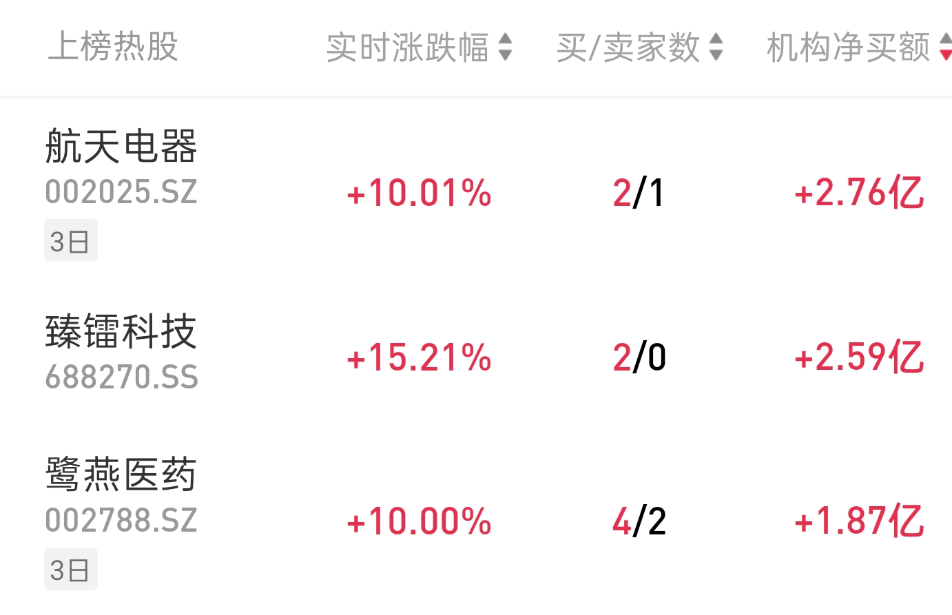 龙虎榜机构热股 今天机构龙虎榜上榜41只个股,净买入20只,净卖出21只。当日机构买入最多的个股前三位是:航天电器(2.76亿)、臻镭科技(2.59亿)、鹭燕医药 (1.87亿)。 | | | | 14/4/ 1 1 002025.SZ | +10.01% | 2/1 | | --- | --- | --- | | 3日 | | | | 臻雷科技 | +15 21% | 2/0 | 航天电器 龙虎榜显示,今日2家机构净买入2.76亿。 中航科工集团旗下,航天连接器龙头,市场占比超过70% 龙虎榜知名游资 一、航天 乾照光电 通宇通讯 个股龙虎榜 公司于2024年底出资3000万元参股卫星核心零部件企业鸿擎科技,强化卫星互联网上游关键部件布局,公司与蓝箭航天同为鸿擎科技股东 催化上,据杭州市人民政府消息,1月7日,国内首个面向海上回收复用的火箭产能基地——箭元科技中大型液体运载火箭总装总测及回收复用基地在杭州钱 塘区正式开工建设。 此外,新浪科技1月8日消息,马斯克提出了航天业有史以来最雄心勃勃的制造目标之一:每年生产1万艘星舰飞船。 山西证券认为,SpaceX IPO打开商业航天估值天花板,蓝箭航天有望成为商 ...