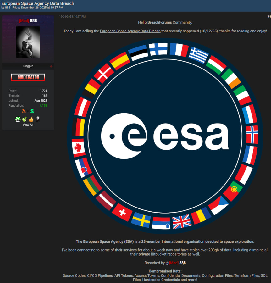 IT之家 12 月 31 日消息,据外媒 cyberinsider 报道,12 月 26 日时有一名黑客"888"在地下论坛发帖,声称其在 12 月 18 日成功 入侵了欧洲航天局(European Space Agency)的内部系统,窃取了超过 200GB 的数据,并计划出售这些内容。 根据该黑客的说法,其掌握的数据内容包括未公开的 Bitbucket 代码仓库源代码、CI / CD 流水线配置、API 接口及访问令 牌、内部文档、SQL 数据库文件、Terraform 基础设施配置,以及硬编码的凭据和配置文件等。 对此,欧洲航天局在 X 平台发文,披露公司近期的确遭黑客入侵,公司在获悉相关情况后已立即展开调查,同步加强了网络 安全防护措施,进一步对可能存在风险的设备进行加固,目前并未发现任何内部机密敏感数据外泄,此次事件仅影响了"极少 量"的外部服务器。这些服务器主要用于"支持科学界内部的合作型工程项目"。 IT之家 12 月 31 日消息,据外媒 cyberinsider 报道,12 月 26 日时有一名黑客"888"在地下论坛发帖,声称其在 12 月 18 日成功 入侵了欧洲航天局(European ...