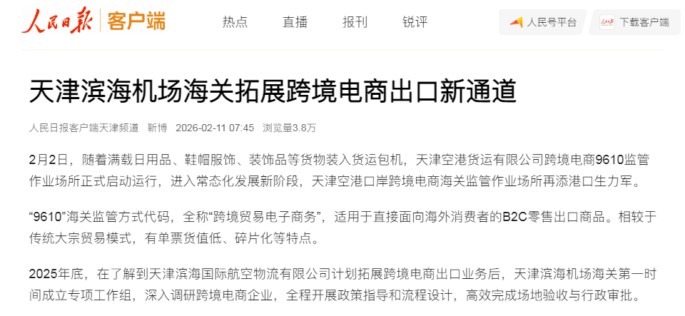 行业动态与政策支持 - 天津空港货运有限公司跨境电商9610监管作业场所于2月2日正式启动运行并进入常态化发展新阶段 此举为天津空港口岸跨境电商海关监管作业场所增添了新的港口生力军 [2] - “9610”海关监管方式代码适用于直接面向海外消费者的B2C零售出口商品 其特点是单票货值低和碎片化 有别于传统大宗贸易模式 [2] - 天津滨海机场海关在了解到企业拓展跨境电商出口业务计划后 于2025年底成立专项工作组 深入调研并全程提供政策指导和流程设计 高效完成了场地验收与行政审批 [2] 运营机制与效率提升 - 针对跨境电商出口货量增长快和时效要求高的特点 天津滨海机场海关建立了“关-企-地”联动协同配合机制 [2] - 海关综合运用风险大数据分析等智慧监管手段 在确保有效监管的前提下实现快速通关 达成了通关效率与监管质量的“双提升” [2] 战略意义与发展影响 - 新通道的落地是海关服务外贸新业态和优化口岸营商环境的具体行动 [2] - 此举是助力天津国际航空物流中心建设以及赋能跨境电商产业链持续扩量增效的关键一步 [2]
