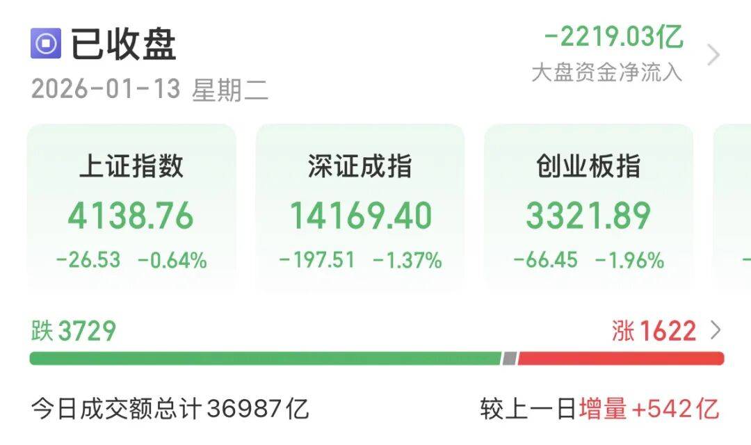 市场整体表现 - 1月13日A股市场放量回调,沪深两市成交额再创历史新高,达到3.7万亿元,较前一日增加500亿元 [1][4] - 上证指数微跌0.64%,结束了此前连续17个交易日的上涨 [1][4] - 创业板指领跌主要指数,跌幅达1.96%,收于3321.89点,深证成指下跌1.37%,科创50与北证50指数跌幅均超过2% [4] - 市场呈现普跌格局,共有3729只个股下跌,其中56只跌停,上涨个股1622只,涨停75只 [8] - 杠杆资金持续活跃,截至1月12日,沪深京两市两融余额增至2.67万亿元 [4] 行业板块表现 - 国防军工板块领跌市场,申万一级行业指数跌幅达5.50%,板块内20只个股跌停,航天环宇跌幅超过18% [4][5][6] - 科技成长板块集体回调,电子、通信、计算机、机械设备等板块跌幅居前,申万电子指数下跌3.30%,通信指数下跌2.88%,计算机指数下跌1.92%,机械设备指数下跌1.78% [4][5][6] - 商业航天概念大幅降温,相关概念指数下跌5.51%,卫星ETF集体回吐涨幅 [1][5] - 部分板块逆势走强,石油天然气、贵金属、医疗服务、CRO、化肥农药等板块表现较好,石油天然气行业指数上涨1.91%,贵金属指数上涨2.63%,CRO概念上涨4.32% [4][5] - 医药生物板块表现突出,申万行业指数上涨1.21%,板块内16只个股涨停,多只个股实现20%涨停 [8][9] 个股交易情况 - 市场交投极为活跃,日成交额不低于100亿元的个股有30只 [8] - 金风科技日成交额最高,超过300亿元,股价收跌3.36% [8][10] - 国防军工板块多只权重股跌停,包括合众思壮、西部超导、北方导航、航天电子、中国卫通、航天长峰、航天发展等 [6][7] - 医药生物板块个股表现强势,诺思格、荣昌生物、普蕊斯、泓博医药、宝莱特、兰卫医学、博济医药、尔康制药等多股录得20%涨停 [8][9] - 部分科技龙头股出现调整,昆仑万维股价下跌超过3%,中际旭创、新易盛、天孚通信均收跌,寒武纪-U下跌6.75% [8][10] 市场分析与解读 - 受访分析人士普遍认为,此次放量回调是连续上涨后的正常技术性调整,而非市场趋势的反转 [3][11] - 巨量成交被解读为多空博弈加剧、筹码快速换手,而非资金单边出逃,表明市场承接力充足 [3][11] - 银行、石油石化等权重板块的护盘行为,凸显了资金面对指数底部的支撑意愿 [11][13] - 回调具有明确的情绪降温属性,与12日盘后多家热门科技公司发布风险提示公告直接相关,属于市场自发的风险释放过程 [11] - 市场正在进行风格切换与情绪修复,前期高热的科技成长板块面临估值消化,而具备基本面支撑或政策催化的方向获得资金青睐 [12] 后市展望与策略 - 机构预计市场短期将转入震荡整理格局,难现单边大涨或大跌,上证指数或在4100点至4150点区间内震荡 [13] - 科技股在回调后提供了布局机会,但不宜盲目追涨,应优先关注业绩确定性高的硬科技、AI算力、军工电子等政策支持的核心赛道 [13] - 建议投资者可考虑分批、逢低介入优质标的,并搭配银行、石油石化等防御性板块以平衡组合风险 [13] - 随着商业航天等主题品种回落,市场可能进入结构再平衡阶段,算力、半导体、机器人等本轮涨幅不大的品种仍有机会 [14] - 科技股内部分化显著,抄底需聚焦优质赛道,避开纯概念炒作标的,重点关注具备硬科技实力与业绩支撑的细分龙头,以及受益于政策导向与产业升级的领域 [15] - AI应用板块有望从主题驱动转向业绩驱动,可关注技术壁垒高、订单落地快的垂直领域以及AI4S平台型企业 [16] - 当前A股牛市的核心逻辑在于投资者信心持续增强,市场震荡上行的基础未被破坏,AI板块及借助AI实现转型升级的传统行业龙头值得重点关注 [17]