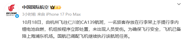 12:39,中国国际航空发文称,10月18日,由杭州飞往仁川的CA139航班,一名旅客存放在行李架上手提行李内锂电池自燃,机组按程序立即处置,未出现 人员受伤。为确保飞行安全,飞机已备降上海浦东机场。国航已调配飞机继续执行该航班任务。 突发! 综合自:都市快报、中国国际航空 据多家媒体报道,今天(10月18日)中午,有网友发文称,杭州飞往韩国的国航航班上,行李架突然着火,航班紧急备降上海浦东。 记者查询"飞常准"信息显示,该航班当天09:47于杭州萧山机场起飞,原计划于12:20抵达首尔仁川机场,实际于11:07备降至上海浦东机场。 END 点击关键字可查看 潜望系列深度报道丨 股事会专栏 丨 投资小红书 丨 e公司调查 丨 时报会客厅 丨 十大明星私募访谈 丨 沉痛悼念!杨振宁因病逝世,享年103岁 丨 苹果重 磅!Apple Intelligence进入中国市场?库克回应→ 丨 视频通话!中美,最新消息! 丨 新动态,大提振!昨夜,A50猛拉! 丨 关税突发!美国总统签署行 政令,11月1日起征收! 丨 深夜大跳水!黄金、白银重挫! 丨 国常会重磅部署! 丨 突发跳水!尾盘跌停! 丨 见证历史!双双突破1 ...