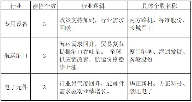 涨停板方面,今日福建板块延续强势,板块内有10只个股涨停,涨停股数量继续领衔各板块。 另外,近期处于三季度业绩公告密集期,不少公司三季度业绩超预期而出现涨停,今日也有较多的业绩 增长概念股涨停。三季度业绩公告将延续至10月底,未来几个交易日仍然有较多上市公司披露三季度业 绩情况。从这一点来看,业绩增长概念的热度可能还会延续,当然也需要提防业绩暴雷个股的风险。 今日上证指数下跌0.22%,深证成指下跌0.44%,个股涨跌幅中位数为下跌0.16%。 申万宏源研报显示,2025年三季报业绩有望保持良好增长或底部回暖的行业有:先进制造、科技 TMT、医药部分细分领域、非银金融业以及部分周期行业。 一、市场总览及板块特征 沪深两市(不含ST个股)涨停58家,较昨日增加8家;跌停4家,较昨日减少1家。 从行业特征来看,今日涨停板个股中,专用设备、航运港口、电子元件行业的个股最多。 | 行业 | 涨停个数 | 行业逻辑 | 具体个股名称 | | --- | --- | --- | --- | | 专用设备 | 3 | 政策支持加码,行业需求 | 南方路机、标准股份、 | | | | 四暖。 | 长城车工 | | 航运港口 ...