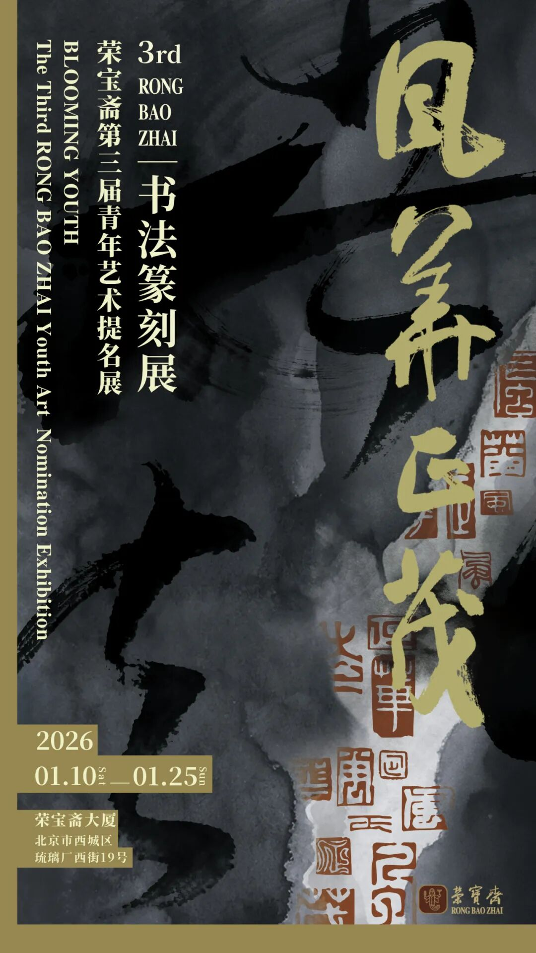 3rd 荣宝篇第二届青年艺术提名展 didx and DNG BAO ZHA Youth Art Nomination Ext HINOX SNINOOTS RONG BAO ZHAI 法赏刻 2026 01 10: 01 258 展览信息 主办单位 荣宝斋有限公司 中国非物质文化遗产保护协会 中央广播电视总台社教节目中心 香港美协 中国国家画院 首席媒体 中央广播电视总台"央博"数字文化艺术博物馆 协办单位 北京中康联公益基金会 学术支持 中国美术家协会 中国书法家协会 中央美术学院 中国美术学院 南京艺术学院 广州美术学院 鲁迅美术学院 四川美术学院 西安美术学院 天津美术学院 湖北美术学院 山东艺术学院 吉林艺术学院 青岛画院 中国画学会 中国工笔画学会 中国人民大学艺术学院 浙江大学艺术与考古学院 中国艺术研究院书法院 中央民族大学美术学院 北京画院 广东画院 山东画院 安徽省书画院 深圳画院 《中国版权》杂志社有限公司 出品人 赵 东 总策划 包 岩 总监制 李春林 展览统筹 张海涛 展览时间 2026年1月10日至2026年1月25日 开幕式时间 2026年1月10日上午10:00 展览地点 中国 ...