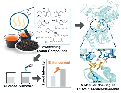 茶汤香气研究技术模式图示。 受访者供图 近日,中国农业科学院茶叶研究所在茶汤风味研究方面取得新进展。研究发现,茶汤中的香气成分 不仅影响茶的香型,还能显著增强天然甜味感知。团队通过分子感官组学和分子对接技术揭示了香气促 进甜味的作用机制,为开发天然甜味增强剂提供了理论依据。这一发现对无糖、低糖茶饮料及其他食品 的研发具有较大应用价值。 "捏鼻子喝茶"有新发现 中国是茶的故乡,茶文化绵延千年。如今,科学家正在用现代技术重新认识这杯茶,从分子层面揭 示香气与味觉之间的互动关系。茶汤中那些微量的香气分子,正在被证明不只是气味的来源,也可能成 为调节口感、引领低糖消费的新钥匙。 "我们在研究茶叶风味化学与品质调控过程中,注意到一个有趣现象:同一杯茶,捏着鼻子喝时, 甜味明显变淡。"中国农业科学院茶叶研究所研究员许勇泉介绍,"长期以来,关于茶汤甜味形成的研究 主要集中在蔗糖、甜味氨基酸等呈味物质上。然而,部分红茶、白茶和黄茶即使糖含量并不高,也能呈 现明显的甜感,这种现象很难被解释。" 随后,科研人员用"计算机模拟对接"技术,发现这些香气具有能帮助蔗糖更紧密结合甜味受体 (T1R2/T1R3)的潜力。许勇泉打了个比方: ...