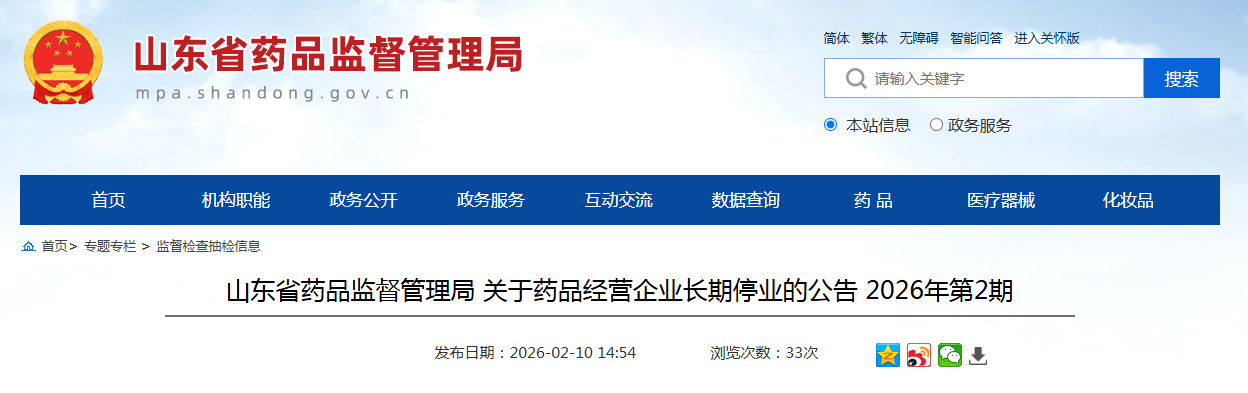 山东省药品监督管理局关于药品经营企业长期停业的公告(2026年第2期)