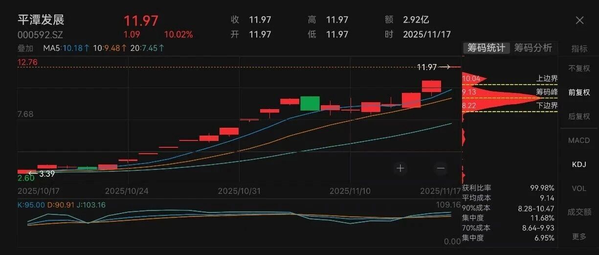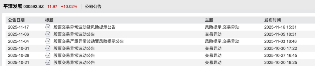 中国基金报记者 牛思若 斩获"22天14板"的大牛股——平潭发展,按下了"暂停键",公司股票将于11月18日开市起停牌,预计停牌时间不超过3个交易日。 11月17日晚间,平潭发展公告称,公司股票自2025年10月17日至11月17日价格涨幅达255.19%,其间于10月20日、10月27日、10月30日、11月3日、11月5 日、11月14日6次触及股票交易异常波动情形,并于11月3日1次触及股票交易严重异常波动情形。 公告强调,公司股票短期内价格涨幅较大,已严重背离公司基本面。此前,平潭发展曾多次发布公告称,公司生产经营、基本面未发生重大变化,公司主 要业务为造林营林、林木产品加工与销售、贸易业务、与平潭综合实验区开放开发的有关业务。 | 公告日期 | 标题 | 主题 | 发布时间 | | --- | --- | --- | --- | | 2025-11-17 | PDF 股票交易异常波动暨风险提示公告 | 风险提示,交易异动 | 2025-11-16 15:31 | | 2025-11-06 | Por] 股票交易异常波动公告 | 交易异动 | 2025-11-05 18:31 | | 2025-11- ...