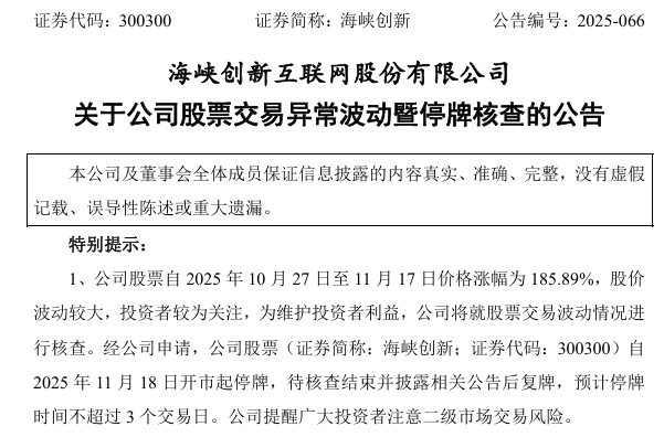 海峡创新(300300)11月17日晚间公告,公司股票自2025年10月27日至11月17日价格涨幅为185.89%, 股价波动较大,投资者较为关注,为维护投资者利益,公司将就股票交易波动情况进行核查。经公司申 请,公司股票(证券简称:海峡创新;证券代码:300300)自2025年11月18日开市起停牌,待核查结束 并披露相关公告后复牌,预计停牌时间不超过3个交易日。公司提醒广大投资者注意二级市场交易风 险。 两家上市公司将停牌核查。 公告称,经向公司控股股东等核实,不存在关于公司应披露而未披露的重大事项,也不存在处于筹划阶 段的重大事项。同时,公司及子公司生产经营正常,主营业务目前没有其他重大变化。 截至11月17日收盘,该公司20%涨停,股价报18.24元/股,总市值121.63亿元。公司股价自10月17日至 今涨幅约为275%。 同日,平潭发展(000592)公告,公司股票自2025年10月17日至11月17日以来价格涨幅为255.19%,其 间于10月20日、10月27日、10月30日、11月3日、11月5日、11月14日,6次触及股票交易异常波动情 形;于11月3日,1次触及股票交易严重异常波动情形 ...
