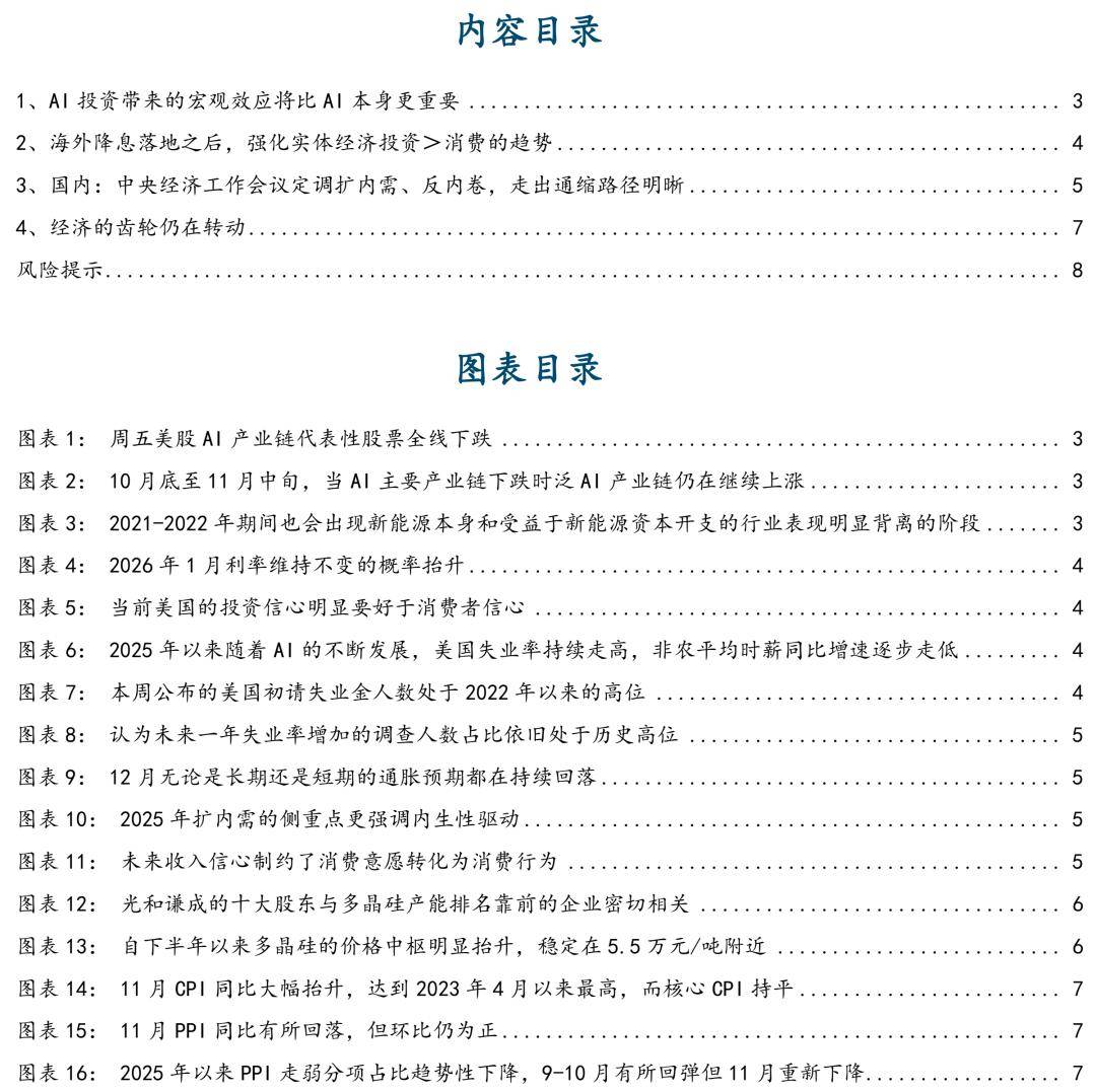 【报告导读】金融市场预期的波动不会改变实体经济运行的趋势。尽管AI股票波动在放大、降息预期存在反复,但未来投资和降息方向都相对更为明 确,经济的齿轮不会因为预期变化而停滞,与现实相关的资产将继续前行。未来基本面受上述两个因素影响带来的潜在变化更值得投资者关注和下注,我 们的主线推荐维持不变。 本周中央经济工作会议定调明年的经济目标,我们认为走出通缩的路径逐步明晰:(1)扩大内需依旧是首位,但实现路径可能不在于加大财政补贴和政 府投资,而是中长期提升居民收入的目标(从2024年的中低收入人群+养老金→更广泛群体的城乡居民增收计划)以及激活民间资本。(2)继续强调中 游制造的反内卷,这为企业盈利的修复打下基础。以光伏的收储计划为例,未来可能会逐步落地。多晶硅的价格已稳定在5.5万元/吨附近。从通胀数据来 看,走出通缩的政策思路已经有所体现:11月CPI同比上涨0.7%,为2023年3月以来最高。同比涨幅扩大主要是食品价格由降转涨拉动,但除此以外服务 性消费价格指数也在上涨:飞机票、家政服务和在外餐饮价格分别上涨7.0%、2.4%和1.2%。PPI虽然同比下降2.2%,但主要受上年同期对比基数走高影 响,环比上看上 ...