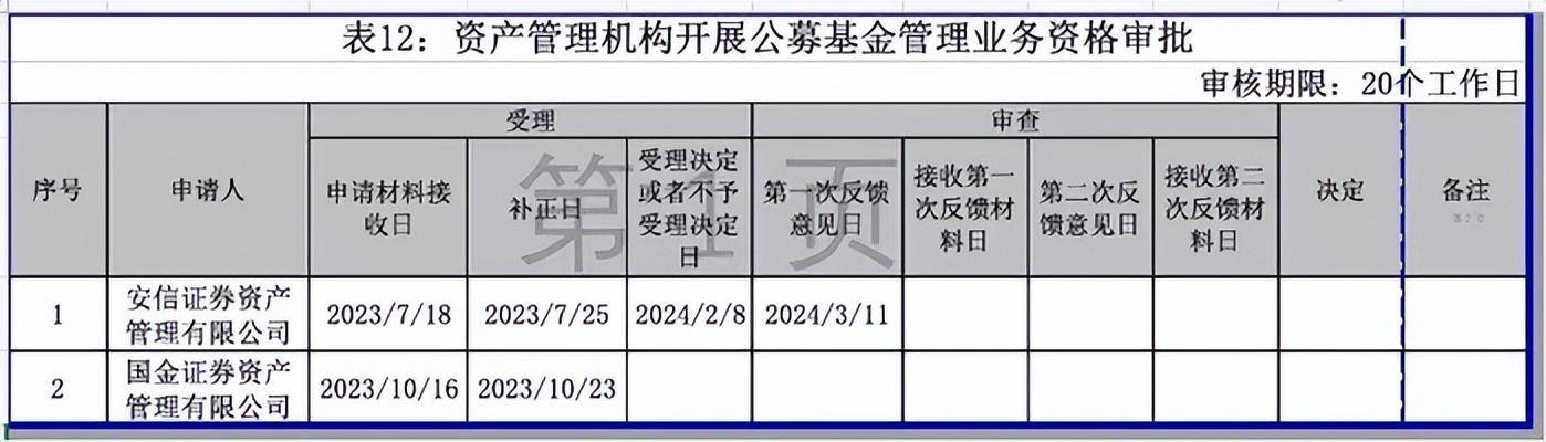 刚过10月,光证资管就紧跟着广发资管的脚步,从证监会的申请名单里悄悄撤了出来。 要知道,光证资管为这张牌照等了两年多,广发资管更是管理着2500多亿资产的头部玩家。 | | | | | | 表12:资产管理机构开展公募基金管理业务资格审批 | | | | | --- | --- | --- | --- | --- | --- | --- | --- | --- | | | | | 受理 | | | 甲在 | | | | 序号 | 申请人 | 申请材料接 | | 受理决定 或者不于 | 第一次反馈 | 接收第一 | 第二次反 | 接收 次反 | | | | 收日 | 补贴 | 受理决定 | 意见目 | 次反馈材 料目 | 馈意见目 | R | | | | | | 1 | | | | | | | 安信证券资产 管理有限公司 | 2023/7/18 | 2023/7/25 | | 2024/2/8 2024/3/11 | | | | | 2 | 国金证券资产 管理有限公司 | 2023/10/16 2023/10/23 | | | | | | | 现在排队的只剩两家,还大半年没动静,这"香饽饽"咋突然就不香了? 等 ...