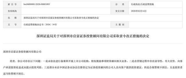 监管处罚决定 - 深圳证监局于2026年2月14日对深圳市启富证券投资顾问有限公司采取责令改正的监管措施[1][3] - 监管措施决定书文号为行政监管措施决定书〔2026〕34号[3] 公司存在的违规问题 - 未依法进行备案即开展上市公司收购、股权激励事项财务顾问相关业务[2] - 在营销过程中存在误导性、夸大宣传,向客户承诺投资收益或未提示投资风险[2] - 部分未在中国证券业协会注册登记为证券投资顾问的公司人员向客户提供投资建议[2] - 公司合规管理不到位[2] - 公司投资者适当性管理不到位[2] 对责任人的处罚 - 时任董事长兼总经理鲁召辉因直接在相关财务顾问业务报告书上签字并对相关问题负有责任,被深圳证监局采取出具警示函的监管措施[4] 公司背景信息 - 深圳市启富证券投资顾问有限公司成立于2001年,是经中国证监会核准的专业证券投资咨询机构[4] - 公司注册资本为2000万元[4] 公司的合规整改举措 - 公司在2026年1月29日组织开展了以“合规护航发展,专业筑牢根基”为主题的全员合规专项培训[5] - 培训聚焦《证券投资顾问业务暂行规定》等法规,采用“理论讲解+案例拆解”模式,系统解读政策并拆解违规案例[5] - 公司表示将建立常态化合规培训机制,健全合规考核与监督体系,深化合规文化建设[5]