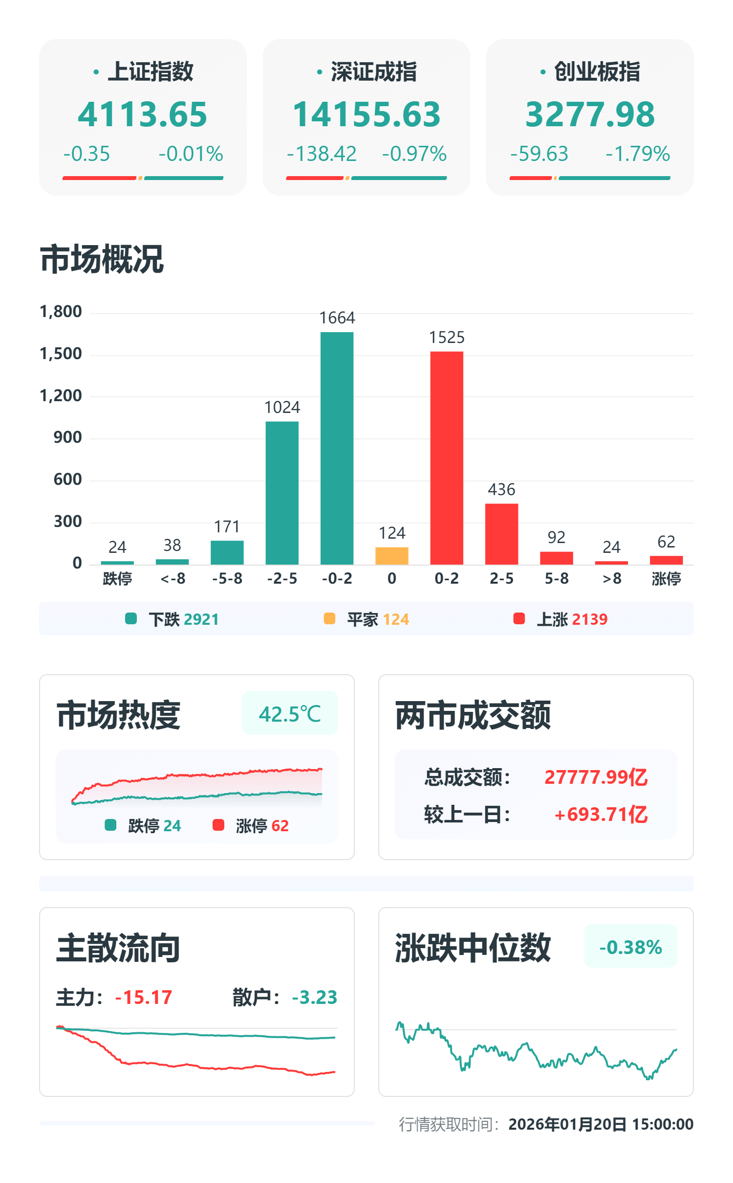 1月20日,A股继续高位盘整,根据交易所数据,上证指数跌0.01%报4113.65点,深证成指跌0.97%,创业板指跌1.79%,沪深300跌0.33%,科创50跌1.58%。 沪深两市2139股上涨,2918股下跌,127股持平;沪深两市合计成交额2.78万亿元,较前一交易日放量约693.72亿元;资金方面,大盘主力资金净流出 1068.43亿元,银行主力资金净流入居首,其次是工程建设、保险、证券、贵金属等板块。 题材方面,环氧丙烷、白银、贵金属、TDI概念股、培育钻石等涨幅居前;太空算力、谷歌概念、低轨卫星、相控阵天线、卫星互联网等跌幅居前。 针对当天走势,资深市场人士徐小明分析,周二市场偏弱,六大指数全绿,但是跌幅不大,个股下跌家数更多,但也没有很悬殊的涨跌家数比,属于相对比 较温和的弱。标的指数上证平盘,指数没动结论也不需要动。 徐小明指出,市场对比17连红没有那么强了,可是也不弱,多数指数是横而不跌,能在高位横住本身就是强势了。2025年4月7日以后的市场走势特征就是这 样,上涨完了横盘,横盘结束继续涨,不断的上涨横盘再继续上涨横盘,就是不跌不调整。 横盘价格虽然不怎么波动,可是细节上还是有变化,像 ...