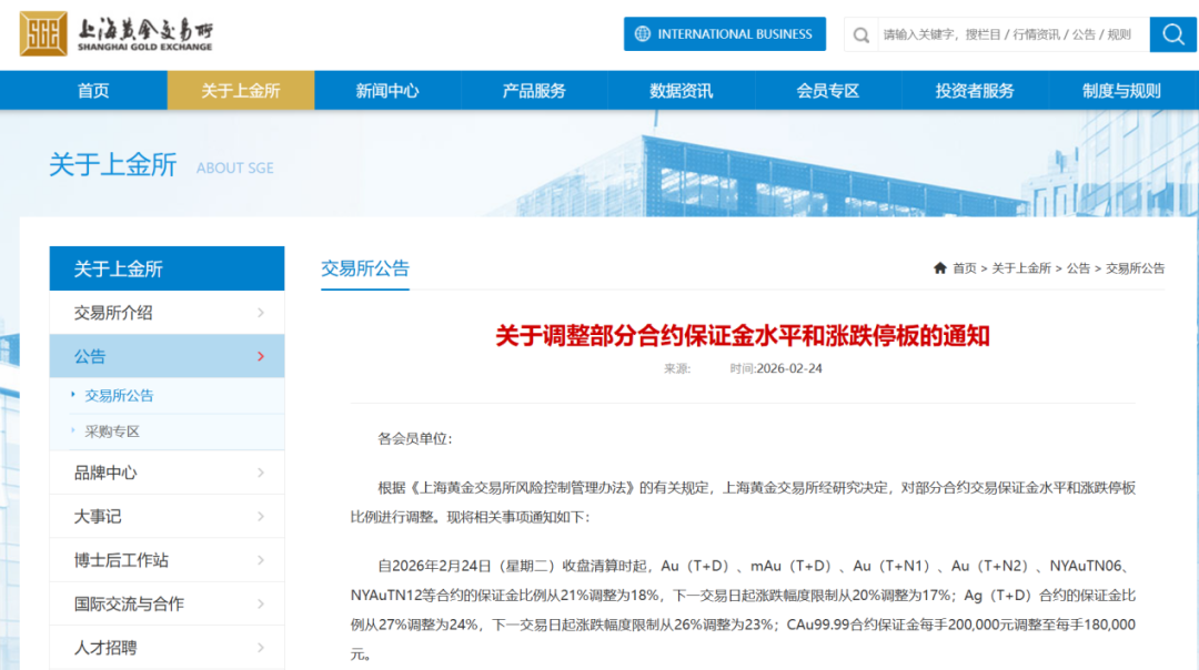 上海黄金交易所调整合约交易参数 - 上海黄金交易所于2026年2月24日收盘清算后,对多个合约的交易保证金比例和涨跌停板比例进行了下调[1][2] - 针对主要黄金合约,包括Au(T+D)、mAu(T+D)、Au(T+N1)、Au(T+N2)、NYAuTN06、NYAuTN12,保证金比例从21%降至18%,涨跌停板幅度从20%放宽至17%[1][2] - 针对白银Ag(T+D)合约,保证金比例从27%降至24%,涨跌停板幅度从26%放宽至23%[1][2] - 针对CAu99.99合约,保证金标准从每手200,000元人民币下调至每手180,000元人民币[1][2] 交易所对市场参与方的要求 - 上海黄金交易所要求各会员单位提高风险防范意识,并制定详细的应急预案[1][2] - 交易所提示会员单位应引导投资者做好风险防范,合理控制仓位,并坚持理性投资[1][2] - 此次调整旨在确保市场的稳定和健康运行[1][2]
