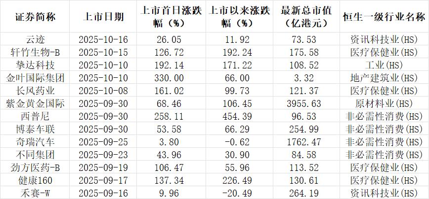 创下7558倍认购新纪录,今年以来港股新股首日平均涨38% 2025年以来,港股市场持续活跃且跑赢全球主要市场。截至10月17日,恒生指数年内累计涨幅达48.10%,恒生科技指数年 初至今累计涨幅达28.92%,均超过标普500指数、纳斯达克指数以及欧洲主流国家的股指涨幅。 今年港股IPO市场也格外活跃,融资总额位居全球第一。2025年前三季度港股新股市场整体表现强劲,共有68只新股上市, 合计实际募资总额约1865亿港元,包括宁德时代、紫金黄金国际、恒瑞医药、三花智控等超大型IPO。与此同时,今年以 来,港股新股破发率仅为22%,创九年新低,首日平均上涨38%,远高于去年同期,尤其9月9日以来上市的14只新股,无一 破发,其中大行科工更是以7558.4倍的认购倍数创下新纪录。 | 证券向称 | 上市日期 | | 上市首日涨跌 上市以来涨跌 | 最新总市值 | 恒生一级行业名称 | | --- | --- | --- | --- | --- | --- | | | | 幅(%) | 幅(%) | (亿港元) | | | 云亦 | 2025-10-16 | 26. 05 | 11. 92 | 73. 53 | ...