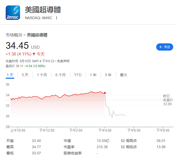 美国超导(AMSC)美股盘后下跌12.6%。彭博援引知情人士报道称,该公司将按每股28-29美元销售股票。隔夜,该公司推销了自家的股票。