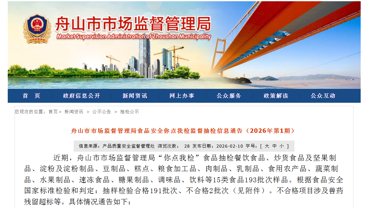 浙江省舟山市市场监督管理局食品安全你点我检监督抽检信息通告(2026年第1期)