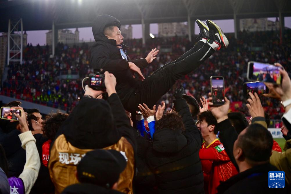 新华社沈阳10月27日电(记者刘艺淳、张逸飞)"中超我们回来了""我们是冠军"的巨幅标语随风舒展,辽宁铁人队的队员们登上花车,面对近三 万名观众的欢呼,鞠躬致意,庆祝一场等待了八年的胜利。 26日,沈阳铁西体育场,辽宁铁人队以1:0战胜南通支云队,提前两轮获得2025赛季中甲联赛冠军并冲超成功。曾见证国足冲入世界杯的沈阳, 时隔八年重返中超版图。 确认结果后,球队主教练李金羽终于松了一口气,"行百里者半九十,不到最后一刻都不能放松"。在他看来,球队冲超成功,稳定的投入、良好 的环境和氛围、优秀的球员缺一不可。 10月26日,辽宁铁人队主教练李金羽(上)在赛后被队员抛向空中。新华社记者 吴青昊 摄 在主场组织千名球迷、见证球队多场胜利的辽沈球迷会会长何大鹏认为,沈阳球迷的热情来自对辽宁足球强烈的归属感。"在这里,不是沈阳球 迷单打独斗,而是全省球迷汇聚在一起摇旗呐喊,把豪情和斗志传递给辽宁铁人队的队员、教练。" "胜利属于所有辽宁人民,以及所有辽宁铁人队的球迷。我们等待了太长时间,我们需要为家乡人民献上一份厚礼。"李金羽感慨道,"这是一个 阶段的胜利,值得欢呼,但从足球发展的角度来看,我们只是迈出了一小步。" ...