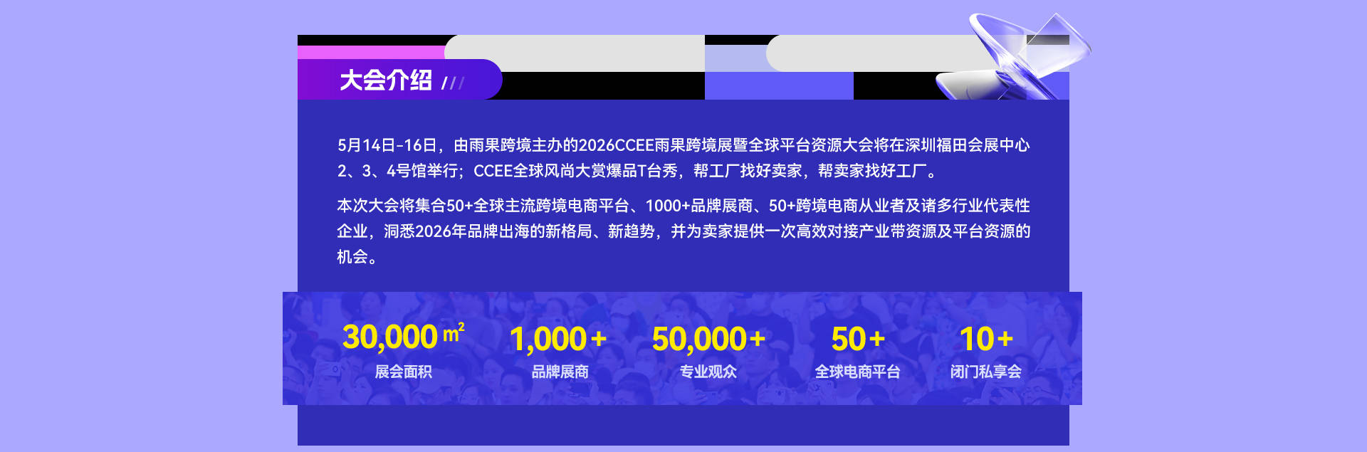 展会基本信息 - 2026年第23届CCEE雨果跨境电商展(深圳)暨全球平台资源大会将于5月14日至16日举行 [1] - 展会地点为深圳会展中心2、3、4号馆 [1] - 展会主题为“智链全球·共赢未来” [1] - 预计吸引超过10万名专业观众到场 [1] 展会规模与核心板块 - 汇聚全球知名电商平台、优质供应链企业、物流服务商及行业专家 [1] - 涵盖平台招商、品牌出海、供应链管理、数字营销、跨境支付、物流仓储等核心板块 [1] - 亚马逊、eBay、速卖通、Shopee等30+全球主流平台将携最新招商政策亮相 [3] - 500+优质工厂将展示最新产品线 [3] - 50+行业大咖将分享前沿趋势与实战经验 [3] 特色活动与专区 - 设立“品牌出海加速器”专区,为成长型品牌提供一站式出海解决方案 [3] - 推出“千人卖家对接会”,实现精准供需匹配 [7] - 举办“选品擂台赛”展示最具爆款潜力的产品 [7] - 设置“跨境电商101”培训课程,为新手卖家提供从入门到进阶的系统教学 [7] - 举办“跨境之夜”社交酒会,为行业精英提供深度交流平台 [7] 同期大会与资源发布 - 全球平台资源大会将发布《2026跨境电商行业白皮书》,深度解析全球市场新机遇 [5] - 大会特设北美、欧洲、东南亚、拉美等区域市场专场,帮助卖家精准把握不同市场运营策略 [5] - 举办“金鼎奖”颁奖典礼,表彰年度优秀跨境电商企业与个人 [5] 展会模式与配套 - 采用“线上+线下”双轨模式,无法亲临现场的观众可通过官方直播平台参与 [7] - 组委会推出智能匹配系统,观众可提前预约心仪展商以提升观展体验 [7] - 展会首日将举办开幕式暨主论坛,邀请政府代表、平台高管、头部卖家共话行业未来 [7] - 深圳作为中国跨境电商之都,拥有完善的产业生态链,参展商可享受特区政策红利并与华南优质供应链资源深度对接 [10]