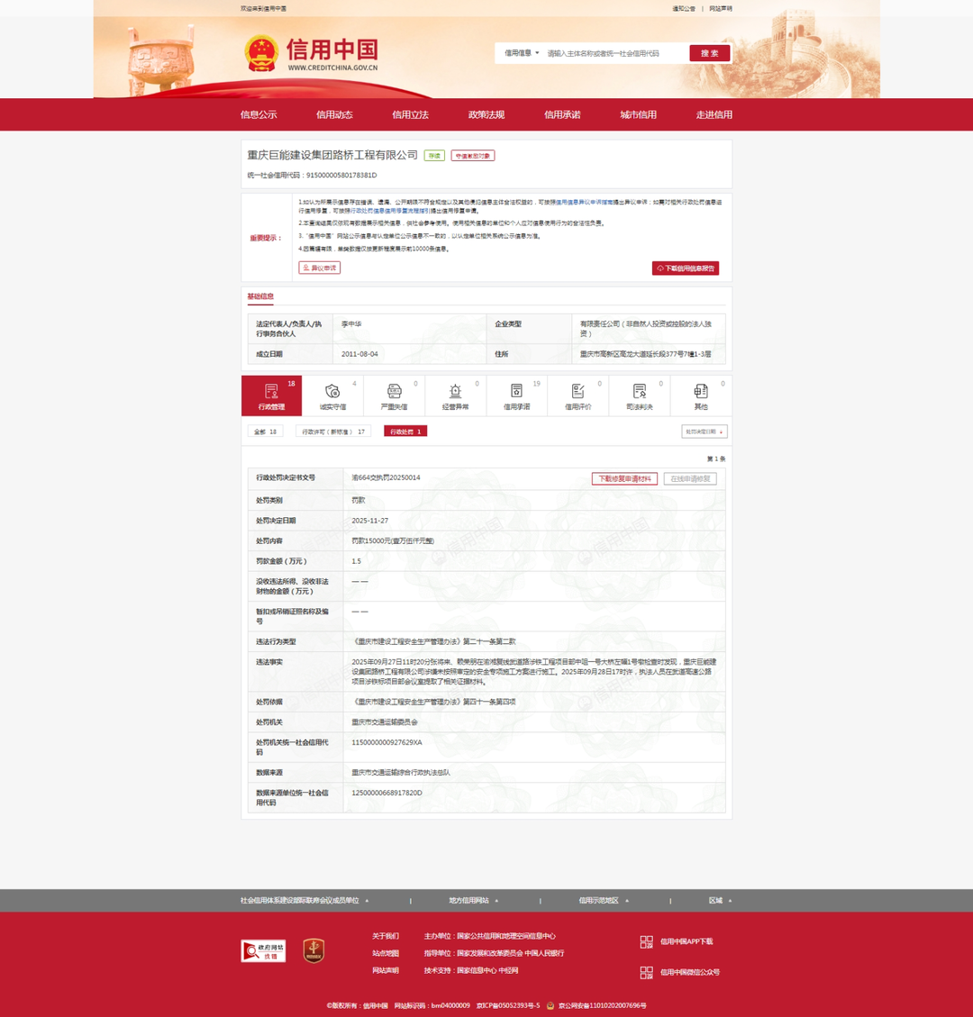 齐鲁晚报·齐鲁壹点记者于信用中国行政处罚栏获悉,11月27日,重庆高速旗下的重庆巨能建设集团路桥工程有限公司(下称"巨能集团路桥公司")收到 1.5万元罚单,处罚机关为重庆市交通运输委员会。 国家企业信用信息公示系统显示,重庆巨能建设集团路桥工程有限公司成立于2011年,注册资本10893.13万元人民币,法定代表人李中华,由重庆高速巨 能建设集团有限公司全资持股,后者是重庆高速巨能建设集团有限公司的全资子公司。 对此,处罚机关依据《重庆市建设工程安全生产管理办法》第四十一条第四项,对其罚款15000元(壹万伍仟元整)。行政处罚决定书文号:渝664交执罚 20250014。 | 首页 | 新闻中心 | 走进我们 | 合资合作 | O | | | --- | --- | --- | --- | --- | --- | | 9 当前位置:首页 > 走进我们 > 公司介绍 > 子分公司 > 产业类 > 巨能集团 | | | | | | | 监管信息 | 其本信息 | 经营信息 | 改革信息 | 人事信息 | 公司介绍 ● | | 集团公司 | 基本信息 | | | | | | 来源: | 发布时间:2023-11- ...