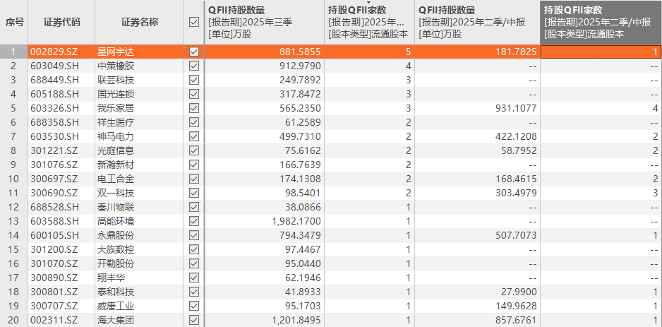 业内人士认为,这一"抱团"买入的动作为市场释放了积极信号,表明外资巨头正基于对中国经济转型和产业升级的长期信心,深度挖掘A股市场的结构性 投资机会。 外资巨头"抱团"买入多只个股 Choice数据显示,根据已披露的上市公司三季报,共有22家A股上市公司截至今年三季度末的前十大流通股股东名单中出现了QFII。其中,多只个股在今 年三季度被两家或两家以上QFII"抱团"买入。 | 序号 | 证券代码 | 证券名称 | QFll接股票 > | | 持股OFII家数 OFII 佳能數書 | 持股QFll家数 | | --- | --- | --- | --- | --- | --- | --- | | | | | | [报告期]2025年三季 | [报告期]2025年 ... | [报告期]2025年二季/中报 [报告期]2025年二季/中报 | | | | | [单位]万股 | | [股本类型]流通股本 [单位]万股 | [股本类型 流通股本 | | | 002829.SZ | 星网宇达 | > | 881.5855 | ટ | 181.7825 | | 2 | 603049.SH | 中策橡胶 | > | 912 ...