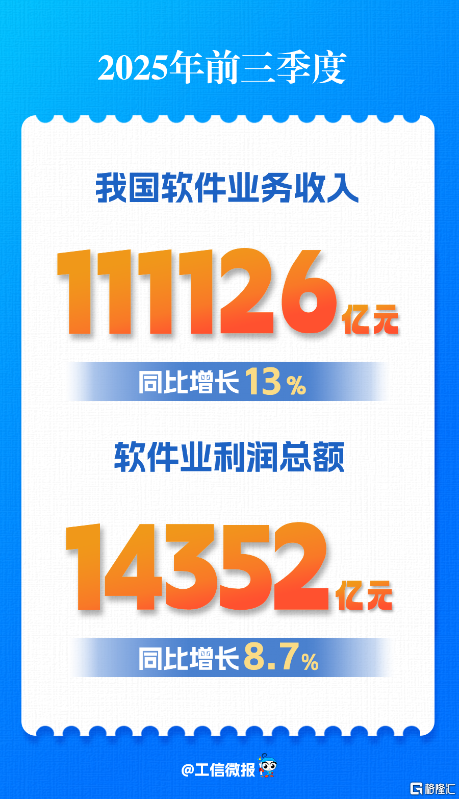 智通财经APP获悉,10月30日,工信部发布2025年前三季度软件业运行情况。2025年前三季度,我国软 件和信息技术服务业(以下简称"软件业")运行态势良好,软件业务收入稳健增长,利润总额增势放缓, 软件业务出口保持正增长。前三季度,我国软件业务收入111126亿元,同比增长13.0%。软件业利润总 额14352亿元,同比增长8.7%。软件业务出口459.4亿美元,同比增长6.6%。 信息安全收入和嵌入式系统软件收入平稳增长。前三季度,信息安全产品和服务收入1627亿元,同比增 长6.9%。嵌入式系统软件收入9212亿元,同比增长8.7%。 原文如下: 三、分地区运行情况 2025年前三季度软件业运行情况 前三季度,东部地区、中部地区、西部地区和东北地区软件业务收入分别同比增长13.3%、13.0%、 10.7%和9.5%。东部地区占全国软件业务总收入的83.8%。京津冀地区软件业务收入同比增长14.6%,长 三角地区软件业务收入同比增长15.0%。北京、广东、江苏、山东、上海软件业务收入居全国前5,同 比分别增长14.9%、9.2%、14.3%、13.4%和20.2%。 2025年前三季度,我国软件和信息 ...