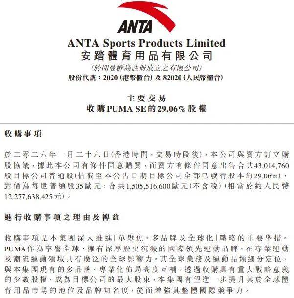 据悉,本次交易预计有望于2026年底前完成,但仍需要得到相关监管部门批准及满足惯例交割条件。此次股权收购资金全部来源于安踏集团的内部自有现 金储备。 1月27日,安踏体育在港交所公告,1月26日,公司与Artémis订立购股协议,公司拟收购Puma SE(简称"目标公司")4301.48万股目标公司普通股(占其 全部已发行股本约29.06%),现金对价为每股普通股35欧元,合共15.06亿欧元(不含税)(相当于约人民币122.78亿元)。目标公司主要从事各类体育 及运动生活产品的开发及销售,产品涵盖PUMA品牌的鞋类、服装及配饰。 安踏体育表示,透过收购具有重大战略意义的少数股权,成为彪马公司的最大股东,集团有望进一步提升其于全球体育用品市场的地位及品牌知名度,从 而增强其整体国际竞争力。 受上述消息影响,27日上午,安踏港股开盘一度大涨超3%,总市值2195亿港元。 | 督加 | | 均价:78.226 盘口 成交 | | --- | --- | --- | | 78.950 | | 3.41% 卖10 78.950 2.40万(37) | | | | 卖9 78.900 4.00万(30) | | | | ...