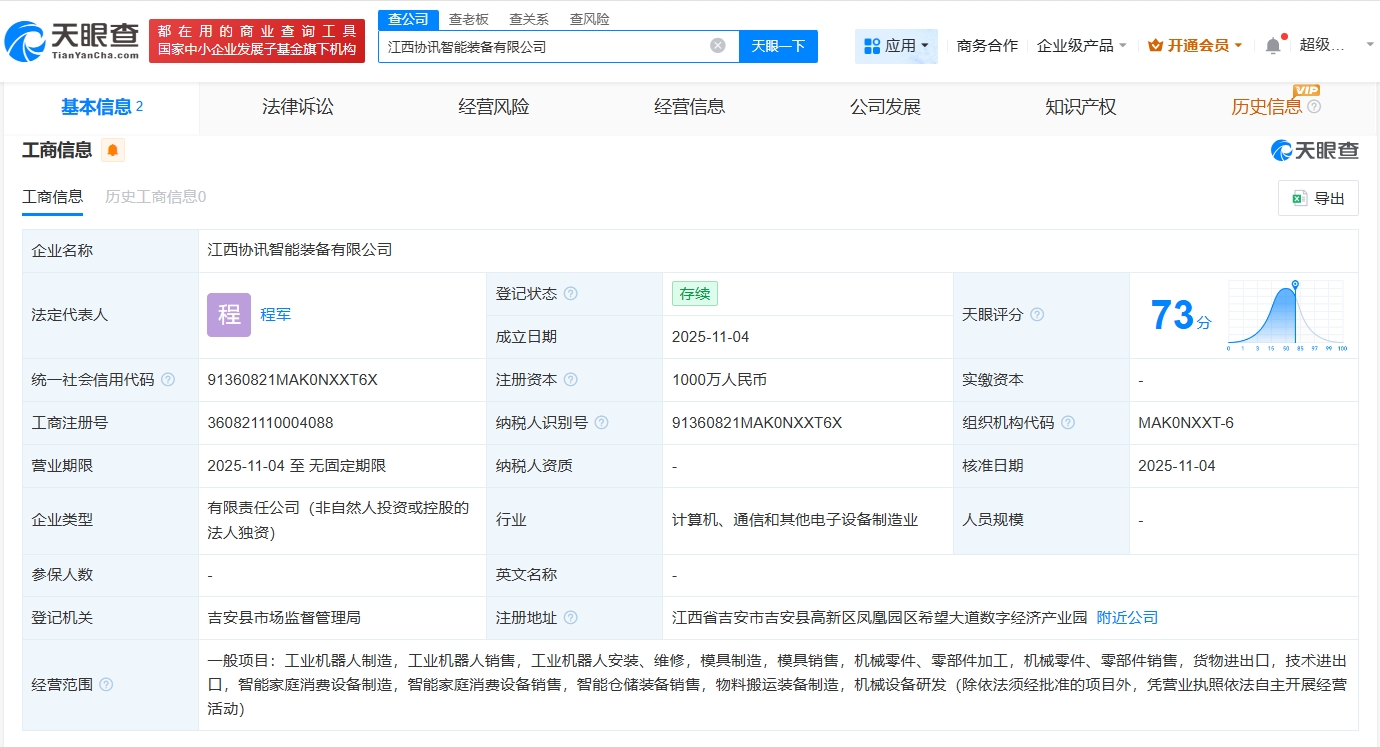 南方财经11月4日电,天眼查App显示,近日,江西协讯智能装备有限公司成立,法定代表人为程军,注册资本1000万人民币,经营范围包括工业机器人制 造、工业机器人销售、智能家庭消费设备制造、智能家庭消费设备销售等。股权全景穿透图显示,该公司由立讯精密(002475)旗下协讯电子(吉安)有限 公司全资持股。 江西协讯智能装备有限公司 | | 都在用的 商业查 询 工 具 | 查公司 查老板 查关系 查风险 | | | | | --- | --- | --- | --- | --- | --- | | | 国家中小企业发展子基金旗下机构 | 江西协讯智能装备有限公司 | (×) 天眼一下 | 品 应用 ▼ | 商务合作 企业级产 | | 基本信息 2 | 法律诉讼 | 经营风险 | 经营信息 | 公司发展 | 知识产 | | 工商信息 ● | | | | | | | 工商信息 历史工商信息0 | | | | | | | 企业名称 | 江西协讯智能装备有限公司 | | | | | | | | 登记状态 ⑦ | 存续 | | | | 法定代表人 | 程 程室 | 成立日期 | 2025-11-04 | | 天眼评分 2 ...