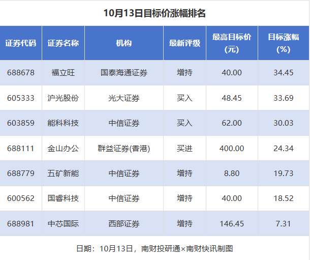 南财投研通数据显示,10月13日,券商给予上市公司目标价共7次,按最新收盘价计算,目标价涨幅排 名居前的公司有福立旺、沪光股份、能科科技,目标价涨幅分别为34.45%、33.69%、30.03%,分别属 于消费电子、汽车零部件、IT服务行业。 从券商推荐家数来看,10月13日有17家上市公司得到券商推荐,包括南钢股份、五矿新能、联化科技等 获得1家推荐。 评级调高方面,10月13日,券商调高1家上市公司评级,东北证券对新益昌的评级从"增持"调高至"买 入"。 | | | 7家最新被首次覆盖的公司 | | | | --- | --- | --- | --- | --- | | 证券代码 | 证券名称 | 机构 | 最新评级 | 行业 | | 600282 | 南钢股份 | 兴业证券 | 增持 | 普钢 | | 300257 | 开山股份 | 国盛证券 | 买人 | 通用设备 | | 688678 | 福立旺 | 国泰海通证券 | 增持 | 消费电子 | | 605333 | 沪光股份 | 光大证券 | 买入 | 汽车零部件 | | 688091 | 上海谊众 | 开源证券 | 买人 | 化学制药 | | 688 ...