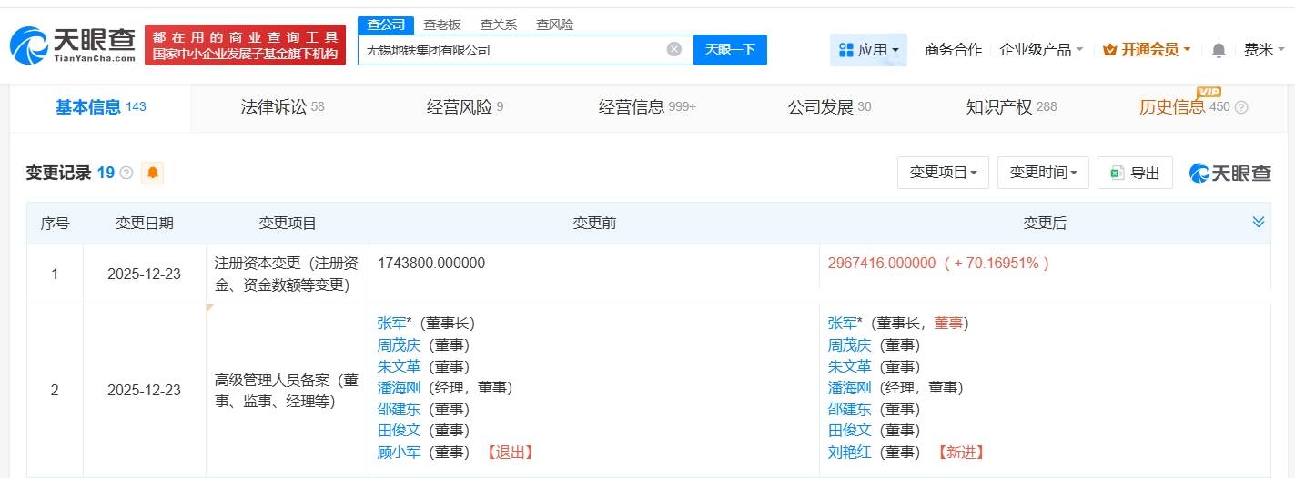 天眼查App显示,近日,无锡地铁集团有限公司发生工商变更,注册资本由174.38亿人民币增至约296.7亿人民币,增幅约70%,同时,部分高管发生变更。 | | | 草公司 音老板 都在用的商业查询工具 | 查关系 音风险 | | | | | --- | --- | --- | --- | --- | --- | --- | | | | 无锡地铁集团有限公司 家中小企业发展子其全旗下机构 | 8 | 天眼一下 | 脂 应用 ▼ | 商务合作 1 | | 基本信息 143 | | 法律诉讼 58 经营风险 9 | 经营信息 999+ | | 公司发展 30 | 知识 | | 股东信息 ● ■ 品股权结构 | | VIP | | | | | | 股东信息6 | 历史股东信息4 | 股权变更历程5 2 | | | | | | 序号 | | 股东名称 | 持股比例÷ | 认缴出资额(万元) = | 认缴出资日期÷ | 间接待股 | | 人民 1 | | 无锡市人民政府国有资产监督管理委员会 品 | 91.7465% 0 | 2722500 | 2025-02-06 | 4.5037 | | 政府 | 实际控制人 | ...