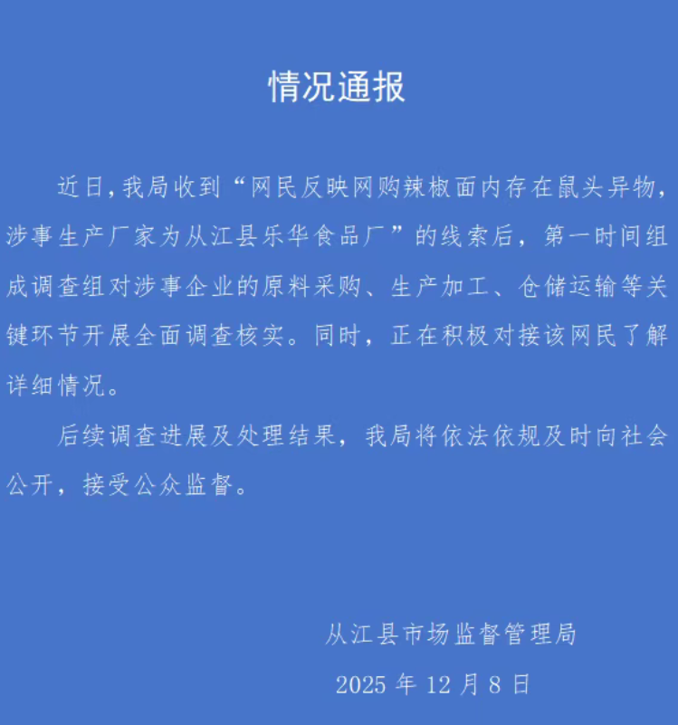 事件概述 - 有网友在社交平台发布视频称,在网购的辣椒面中发现一带毛、形似老鼠头的异物,该网友表示已多次回购该产品,发现异物后感到非常恶心 [1][4] - 涉事产品包装显示生产商为贵州从江县乐华食品厂 [4] 涉事公司情况 - 涉事公司为贵州省从江县乐华食品厂,成立于2020年,位于贵州省黔东南苗族侗族自治州 [6] - 公司是一家以从事酒、饮料和精制茶制造业为主的企业,企业注册资本为50万人民币 [6] 官方调查进展 - 贵州从江县市场监督管理局在获知此事后,第一时间组成调查组深入涉事食品厂调查 [4] - 调查组对涉事企业的原料采购、生产加工、仓储运输等关键环节开展全面调查核实,并正在积极对接该网民了解详细情况 [4] - 县市监局相关人士表示,在鉴定结论出来之前,不方便进行评价 [4] - 贵州从江县市场监督管理局于12月8日深夜发布了初步情况通报,表示后续调查进展及处理结果将依法依规及时向社会公开 [4]