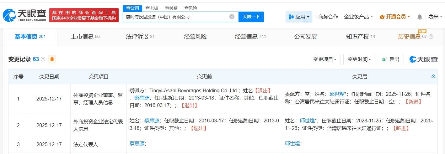 雷达财经讯,天眼查App显示,近日,康师傅饮品投资(中国)有限公司发生工商变更,蔡慈源卸任法定代表人、董事长,由邱世煌接任。 宣 工商自主公示股东 该公司成立于2011年5月,注册资本约5.5亿人民币,经营范围包括在国家允许外商投资的领域依法进行投资,为其母公司、关联公司、所投资企业提供品牌 推广、市场营销服务等,由KSF Beverage Holding Co.,Ltd.全资持股。 | | | 草公司 首老板 音关系 音风险 | | | | | --- | --- | --- | --- | --- | --- | | | 都在用的商业查询工具 家中小企业发展子基金旗下机构 | 康师傅饮品投资 (中国) 有限公司 | | × 天眼一下 | ● 应用 ▼ 商务合作 | | 基本信息 281 | 上市信息 66 法律诉讼 21 | | 经营风险 | 经营信息 741 | 公司发展 | | 变更记录 63 0 ● | | | | | 变更项目。 | | 序号 变电日期 | 变更项目 | 变更前 | | | | | 1 2025-12-17 | 外商投资企业董事、监 | 委派方:Tingyi-Asahi Bever ...