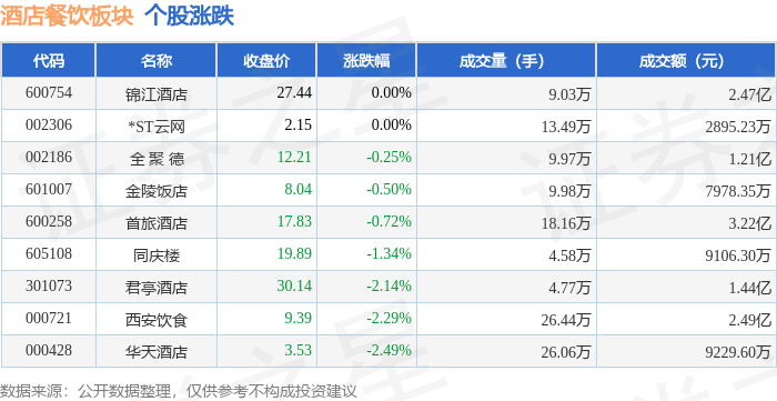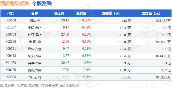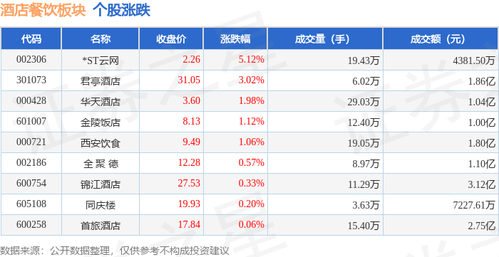 从资金流向上来看,当日酒店餐饮板块主力资金净流出895.69万元,游资资金净流出5532.07万元,散户 资金净流入6427.76万元。酒店餐饮板块个股资金流向见下表: 证券之星消息,1月22日酒店餐饮板块较上一交易日上涨0.74%,*ST云网领涨。当日上证指数报收于 4122.58,上涨0.14%。深证成指报收于14327.05,上涨0.5%。酒店餐饮板块个股涨跌见下表: | 代码 | 名称 | 收盘价 | 涨跌幅 | 成交量(手) | 成交额(元) | | --- | --- | --- | --- | --- | --- | | 002306 | *ST云网 | 2.26 | 5.12% | 19.43万 | 4381.50万 | | 301073 | 君亭酒店 | 31.05 | 3.02% | 6.02万 | 1.86亿 | | 000428 | 华天酒店 | 3.60 | 1.98% | 29.03万 | 1.04亿 | | 601007 | 金陵饭店 | 8.13 | 1.12% | 12.40万 | 1.00亿 | | 000721 | 西安饮食 | 9.49 | 1.06% | 19.05万 ...