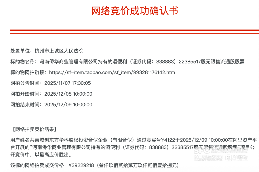 在经历实控人余增云失联、续贷难、业绩扭亏承压等一系列窘境后,酒便利终于看到了曙光。日前,共青城创东方华科股权投资合伙企业(有限合伙)(以 下简称"创东方华科")以6840万元实际竞拍价格拿下酒便利约51%股权,这意味着酒便利将迎来新实控人,而这或许能帮助其甩掉历史包袱,有助于后续稳 定经营。 企查查显示,创东方华科并非首次跨界酒类渠道,此前投资酒仙网络科技股份有限公司、天津酒快到新零售有限公司等。在业内看来,此次拿下酒便利或许 将有助于"同业整合",实现渠道资源深度协同。 市场价七成成交 12月9日,酒便利控股股东河南侨华商业管理有限公司(简称"河南侨华")持有酒便利3831.2119万股股份(占其所持股份的96.26%,占酒便利总股本的 51%)被创东方华科竞得。 此次司法拍卖,源于河南侨华2023年1月至9月为融资提供的质押担保,共计3831.2119万股。由于河南侨华未履行生效法律文书确定的义务,法院判决中国 农业银行股份有限公司杭州分行有权就河南侨华所持上述酒便利股份,以拍卖、变卖该股权所得价款优先受偿。 此次所拍股份是分成三笔进行拍卖,实际拍下价格约6840万元,约为市场评估价的七成。其中,29.8 ...