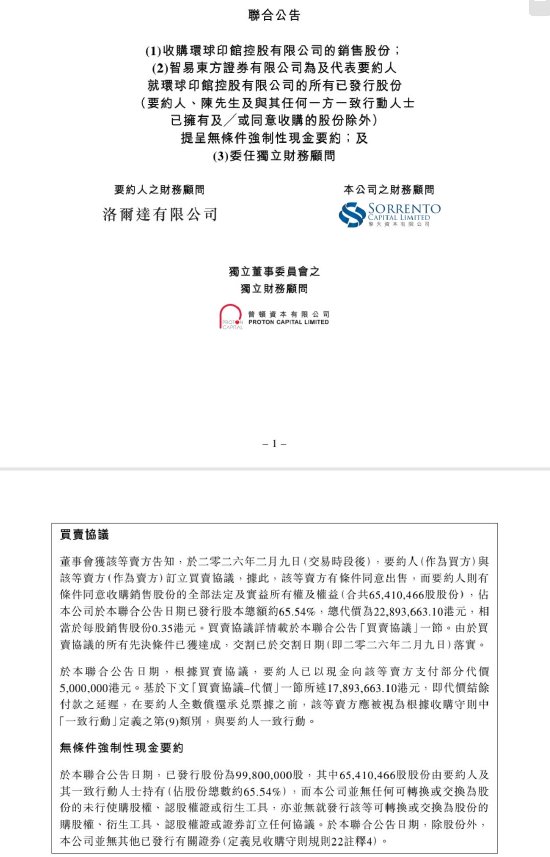 交易核心 - 港股上市公司环球印馆宣布,名品世家董事长陈明辉通过其全资持有的Digital Intelligence Holdings Limited,收购公司约65.54%的股份 [1] - 交易总代价约为2289万港元 [1] - 由于收购后持股比例超过50%,触发了香港《公司收购及合并守则》规定的强制性全面要约 [1] 要约收购细节 - 陈明辉将以每股0.35港元的价格,向剩余小股东发出全面收购要约 [1] - 该要约价格较市场价折让约28.57% [1]