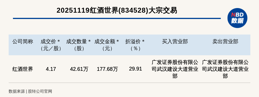 每经讯,2025年11月19日,新三板创新层公司红酒世界(834528,收盘价:3.21元)发生一笔大宗交易,成交价4.17元/股,成交 数量42.61万股,成交金额177.68万元,溢价29.91%。买入营业部是广发证券股份有限公司武汉建设大道营业部,卖出营业部是 广发证券股份有限公司武汉建设大道营业部。 免责声明:本文内容与数据仅供参考,不构成投资建议,使用前核实。据此操作,风险自担。 (记者 曾健辉) 每日经济新闻 ...