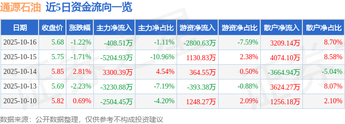 证券之星消息,截至2025年10月16日收盘,通源石油(300164)报收于5.68元,下跌1.22%,换手率 11.13%,成交量64.89万手,成交额3.69亿元。 | | | | | 日期 收盘价 涨跌幅 主力净流入 主力净占比 游资净点比 游资净占比 散户净占比 | | | | | | --- | --- | --- | --- | --- | --- | --- | --- | --- | | 2025-10-16 | 5.68 -1.22% | | -408.51万 | -1.11% | -2800.63万 | -7.59% | 3209.14万 | 8.70% | | 2025-10-15 | 5.75 -1.71% | | -5204.93万 | -10.96% | 1130.83万 | 2.38% | 4074.10万 | 8.58% | | 2025-10-14 | | 5.85 2.81% | 3300.39万 | 4.54% | 364.55万 | 0.50% | -3664.94万 | -5.04% | | 2025-10-13 | 5.69 -2.23% | | -3230.88万 ...