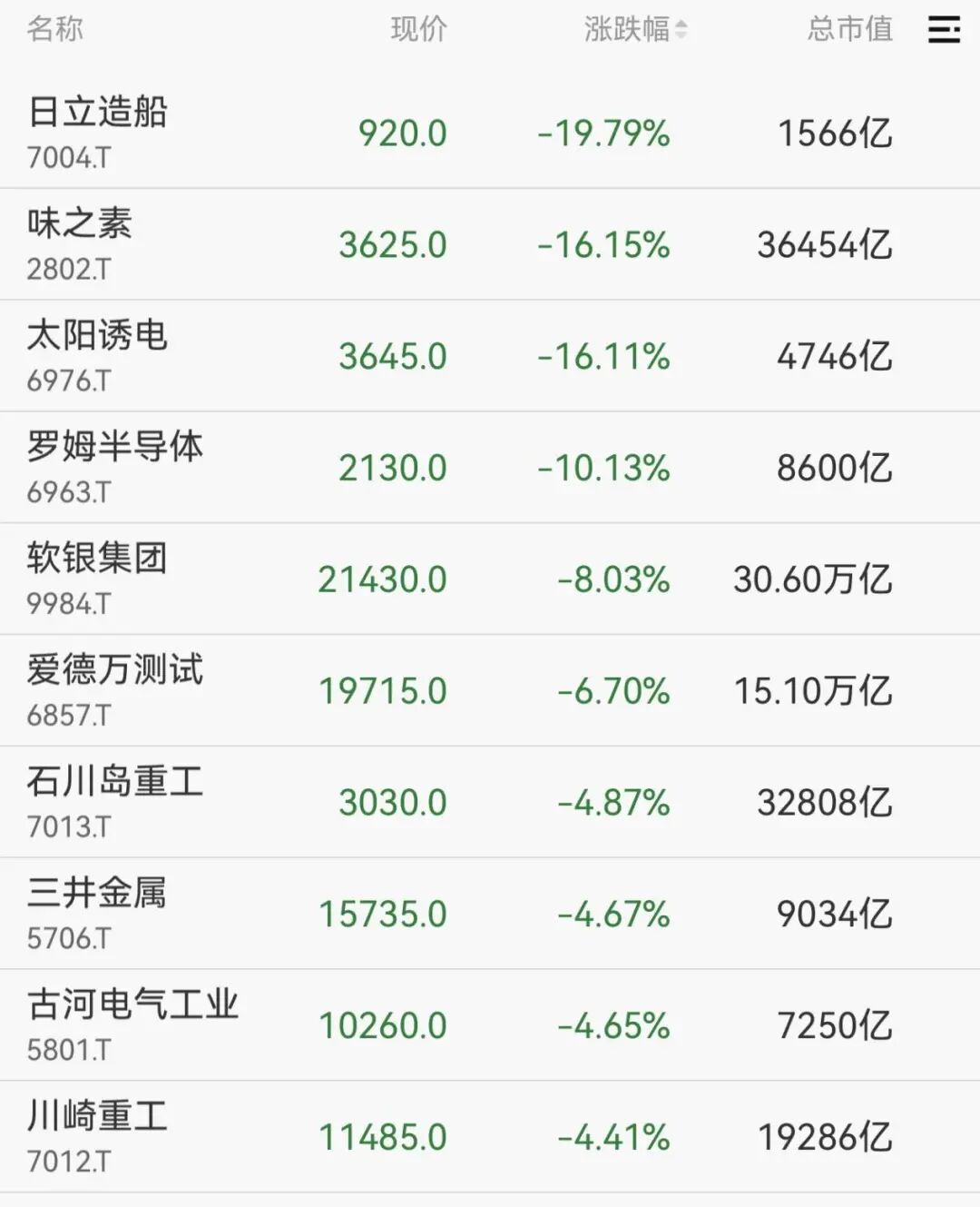 全球及区域市场表现 - 隔夜美国三大股指全线收跌[1] - 日经225指数跌破50000点关口,截至发稿跌幅超8%[1] - 韩国KOSPI指数低开高走后快速跳水,现跌超2%[5] 日本主要公司股价异动 - 软银集团股价跌超8%,总市值30.60万亿日元[1][2] - 味之素股价跌超16%,创2011年3月以来最大跌幅[1] - 爱德万测试股价跌超6%,总市值15.10万亿日元[1][2] - 日立造船股价下跌19.79%[2] - 太阳诱电股价下跌16.11%[2] 日本经济数据与公司财报 - 日本9月所有家庭支出同比上升1.8%,低于预期的2.50%和前值2.30%[4] - 味之素2026财年中报显示半年度总营收7388.81亿日元,同比减少0.72%[3] - 味之素半年度股东应占利润512.45亿日元,同比增长2.03%[3] 韩国经济数据 - 韩国10月消费者物价指数同比上涨2.4%,核心物价同比上涨2.2%[6] - 韩国9月国际收支经常项目实现134.7亿美元顺差,创历年同期最高纪录[6] - 韩国国际收支经常项目连续第29个月保持顺差[6]