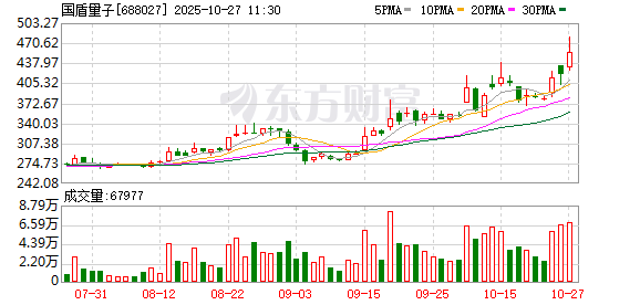 10月30日盘中科创板股国盾量子涨停,截至11:21,股价报613.20元,成交49.77亿元,换手率11.09%, 振幅20.20%。 10月18日公司发布的三季报数据显示,前三季公司共实现营业收入1.90亿元,同比增长90.27%,实现净 利润-2646.96万元,同比增长51.98%。 从机构评级来看,近一个月该股获2家机构买入评级。10月22日国金证券发布的研报给予公司买入评 级。10月21日国海证券发布的研报给予公司买入评级。(数据宝) (文章来源:证券时报网) 融资融券数据显示,该股最新(10月29日)两融余额为14.20亿元,其中,融资余额为13.98亿元,较上 一个交易日增加1815.13万元,增幅为1.32%;融券余额为2199.40万元,较上一个交易日增加277.52万 元,增幅为14.44%。近10日两融余额合计增加2.34亿元,增幅为19.69%,其间融资余额增长19.44%,融 券余额增长38.50%。 科创板个股中,截至发稿上涨的有280只,下跌的有301只,上市5日内的C奕材-U、C禾元-U、C必贝特- U等,涨幅较高的有C奕材-U、C必贝特-U、C禾元-U,涨幅为13.98%、 ...