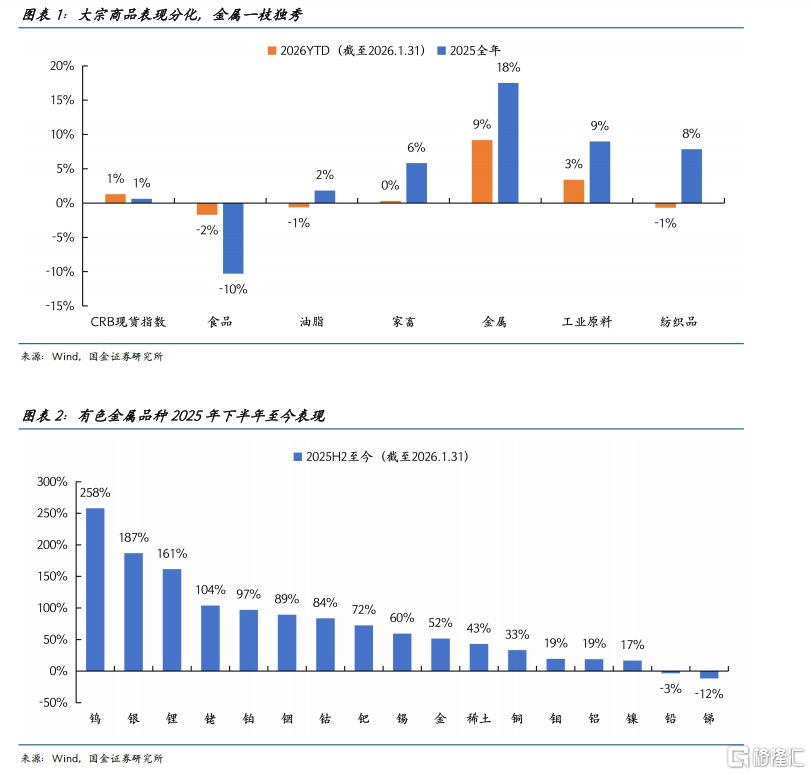 核心观点 报告认为,政策调控力度加大以稳定市场,A股未来走势将更趋稳健,投资策略应淡化指数波动,聚焦高业绩增速板块[2][8] 核心投资机会在于全球资源资产定价机制正发生“范式转移”,以白银价格突破100美元/盎司为标志,“类金本位”思潮回归,大宗商品面临系统性重估,涨价资源股是最值得关注的方向[2][8][26] 同时,科技领域的半导体、服务业消费及港股科技也值得重点关注[2][8] 市场资金面与政策调控 - **ETF资金大规模净流出,市场降温信号明显**:本周(1/19-1/23)ETF净流出规模达**3252.3亿元**,主要来自沪深300、上证50、中证1000等宽基指数ETF[4][14] 同期融资资金也转为净流出**69.0亿元**[4][14] - **重要机构投资者持仓结构**:根据2025年四季度基金季报,重要机构投资者持有ETF规模超**1.5万亿元**,其中沪深300ETF占比最高,规模接近**1万亿元**[5][10][13] 经过近期流出后,估算其剩余持仓规模仍在**1万亿元**左右,仍以沪深300为主[5][22] - **政策意图在于防止市场大起大落**:结合多方面信息,政策对市场降温的力度正在不断加大,旨在使未来A股走势更加稳健[2][8] 全球资源资产定价范式转移 - **标志性事件:白银价格突破100美元**:2026年1月23日夜盘,伦敦银现货与纽约银期货价格突破**100美元/盎司**,这被视为全球货币体系新变化的开始[6][26][40] - **定价逻辑发生根本性变化**:全球资源资产的定价机制正从单纯的周期性商品框架,切换至包含“稀缺实物资产”与“战略储备”溢价的复杂模型[6][26][32] 矿产资源(尤其是能产出“终极支付等价物”的矿山)价值面临系统性重估[6][26] - **“铜金比”、“铝金比”揭示巨大上涨空间**:以回归2008年以来历史均值为假设,在当前金价下,**铜价**预期可回升至**1.8万至2.3万美元/吨**,涨幅在**42%至79%** 之间;**铝价**预期在**5143至7373美元/吨**之间,涨幅在**62%至130%** 之间[6][32][33] - **核心驱动因素**: - **美元信用松动与“去美元化”叙事**:2022年俄乌冲突后,美元信用基础松动,各国央行持续增持黄金,贵金属“准货币”属性回归[26][27][45] - **资源安全上升为国家战略**:全球化重构下,关键矿产资源的安全成为大国竞争核心,供给端注入“地缘政治风险溢价”[29][30] - **中美政策共振带来需求支撑**:2026年中国“十五五”规划开启新基建投资,美国面临中期选举可能采取“宽财政+宽货币”政策,形成需求共振[31] 全球大类资产异动分析 - **美元指数加速下行**:本周美元指数下跌,主要非美货币如欧元、英镑、日元对美元升值幅度均超**1.5%**[39] 驱动因素包括地缘政治风险、美联储独立性担忧、日本干预汇率预期及外资机构减持美债计划等[7][39] - **大宗商品价格普涨**:弱美元环境为大宗商品上涨提供了有利的流动性环境[7][43] 本周COMEX白银最高至**103.53美元/盎司**,COMEX黄金最高至**4991.4美元/盎司**,LME锡价上涨**18%**,创**5.69万美元/吨**新高[40] ICE布油本月累计上涨**8.49%**[41] - **潜在风险**:当前大宗商品价格上涨已计入较多弱美元预期,若美元走势不及预期或出现阶段性反转,高价资产将面临回撤风险[7][48] A股市场表现与行业景气 - **市场整体震荡整固**:本周(1/19-1/23)A股主要指数涨跌互现,小盘价值、中证500指数表现较好,分别上涨**4.43%** 和 **4.34%**,而上证50、大盘价值指数下跌[56] 全A日均成交额降至 **28194.2亿元**,环比下降 **15.3%**[56] - **行业表现分化**:本周涨幅居前的申万一级行业为建筑材料(**9.23%**)、石油石化(**7.71%**)和钢铁(**7.31%**),跌幅较大的为银行(**-2.70%**)、通信(**-2.12%**)和非银金融(**-1.45%**)[57] - **12月景气数据**: - **消费**:12月社会消费品零售总额同比增长**0.9%**,增幅持续收窄[63] 通讯器材类消费同比增长**20.9%**,表现亮眼[64] - **生产**:12月集成电路产量达**481.0亿块**,同比增长**12.9%**,三个月滚动同比增幅扩大至**15.4%**[66] 新能源汽车市场占有率达**52.3%**[73] - **地产**:1-12月商品房销售额累计**8.39万亿元**,同比下降**12.6%**,降幅扩大[80] 主题风向:CPU行业迎来涨价周期 - **服务器CPU供需极端失衡**:因AI需求激增,英特尔与AMD的服务器CPU产能售罄,计划将产品价格上调**10%-15%**[4][101] - **需求爆发与供给刚性约束共振**:AI推理应用扩大,CPU在数据中心的核心作用日益凸显,云厂商愿意签署长期协议锁定产能[102] 但英特尔CEO坦言良率提升未达预期,供给端技术壁垒导致产能释放滞后,供需缺口短期难解[102][105] - **DeepSeek新架构提升CPU需求**:DeepSeek发布的Engram架构将大规模记忆参数存储于CPU内存,并对CPU的数据预取、调度及与GPU的协同能力提出了更高要求[106][110][111]