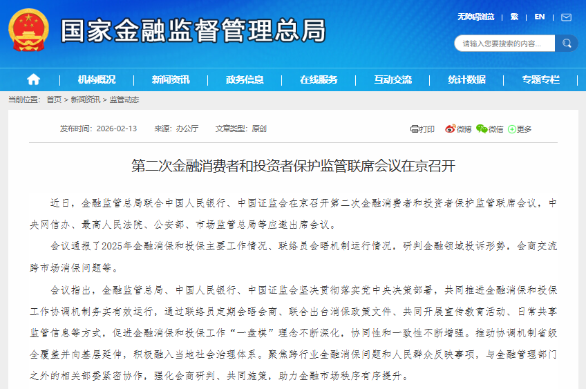 会议概况与核心目标 - 金融监管总局联合中国人民银行、中国证监会于2月13日召开第二次金融消费者和投资者保护监管联席会议,中央网信办、最高人民法院、公安部、市场监管总局等部委应邀出席 [1] - 会议核心目标是深化金融消费者和投资者保护工作的协同机制,提升跨市场监管的一致性与有效性,以提升金融市场秩序 [1][2] 过往工作成果与机制建设 - 会议通报了2025年金融消费者和投资者保护主要工作情况及联络员会晤机制运行情况,并研判了金融领域投诉形势 [1] - 金融监管总局、中国人民银行、中国证监会通过联络员定期会晤、联合出台政策、共同开展宣传教育、日常共享监管信息等方式,深化了“一盘棋”工作理念,增强了协同性和一致性 [1] - 已推动协调机制实现省级全覆盖并向基层延伸,积极融入当地社会治理体系 [1] - 聚焦跨行业金融消费者保护问题和人民群众反映事项,与金融管理部门之外的相关部委紧密协作,强化会商研判与共同施策 [1] 未来工作重点与监管要求 - 会议强调将持续深化金融消费者和投资者保护工作协调机制,充分发挥联席会议和联络员会晤机制的功能作用 [2] - 将指导地方完善辖区协调机制,在投诉源头治理、纠纷多元化解、跨市场消费者保护问题治理等方面加强协同联动 [2] - 将推动跨部门会商研判更加精准有效,汇聚各部门专业优势,着力破解难点堵点问题 [2] - 将进一步健全完善投诉处理、纠纷调解、信息共享、公众教育、消费者反映强烈问题治理等工作机制 [2] - 将督促金融机构在经营管理业务中全面贯彻金融消费者和投资者保护要求,加强全链条、全流程管理,切实落实主体责任 [2]