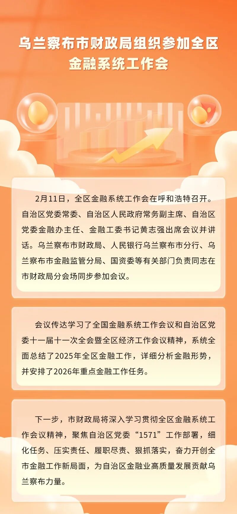 会议概况 - 2025年2月11日,内蒙古自治区全区金融系统工作会议在呼和浩特召开 [5] - 自治区党委常委、常务副主席、党委金融办主任、金融工委书记黄志强出席会议并讲话 [5] - 乌兰察布市财政局、人民银行乌兰察布市分行、乌兰察布市金融监管分局、国资委等有关部门负责人在市财政局分会场同步参会 [5] 会议内容与精神 - 会议传达学习了全国金融系统工作会议和自治区党委十一届十一次全会暨全区经济工作会议精神 [5] - 会议系统全面总结了2025年全区金融工作,并详细分析了金融形势 [5] - 会议安排了2026年全区重点金融工作任务 [5] 后续工作方向 - 乌兰察布市财政局表示下一步将深入学习贯彻全区金融系统工作会议精神 [6]