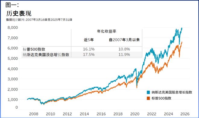 文章核心观点 - 在美股市场波动加剧、不确定性上升的背景下,构建具备防御属性和长期成长潜力的投资组合是关键 [1] - 纳斯达克美国股息增长指数通过质量与股息成长因子构建,在长期收益率和抗跌性方面表现优于标普500等基准指数,是构建防御性资产配置的有效工具 [2][4][14] 产品表现与历史回溯 - 过去二十年,纳斯达克美国股息增长指数的年化收益率较标普500指数高出约1.1至1.4个百分点 [2] - 在熊市阶段,该指数相较于纳斯达克100指数的投资组合胜率从牛市及调整期的32%提升至66%,并实现2.2%的超额收益,抗跌性更优 [4] - 过去二十年,该指数的年化收益率稳定超越标普500约1.1% [14] 产品策略与编制方法 - 产品采用Smart Beta策略,通过质量筛选与股息增长因子进行选股,实现行业多元化并具备防御性特质 [5] - 指数通过严格的基本面筛选,聚焦营收与股息持续稳健增长的企业 [9] - 指数采用等权重分配,前十大持仓中单一公司权重均低于3%,不依赖单一强势个股 [12] - 指数结合等权重配置与行业分散化布局 [14] 产品市场认可与规模 - 截至2025年7月31日,追踪该指数的ETF(代码RDVY)在美国的总管理资产规模已达到150亿美元 [10] - 该产品在5年总回报率方面领先于同类美股红利产品,过去五年的资金流入也位居同类产品之首 [10] 行业配置与持仓特征 - 从行业权重分布看,金融行业占比最高,约30% [12] - 相较于纳斯达克100或标普500,该指数在科技行业的配置更加分散,有助于降低波动和提升抗跌能力 [12] 资产配置应用 - 该指数可与纳斯达克100指数灵活组合,构建成长、平衡及防御三种不同风格的资产配置组合 [7] - 若将纳斯达克美国股息增长指数的配置比例从成长风格的25%提升至防御风格的75%,可使年化波动率降低2%,并提升投资组合的夏普比率 [7]