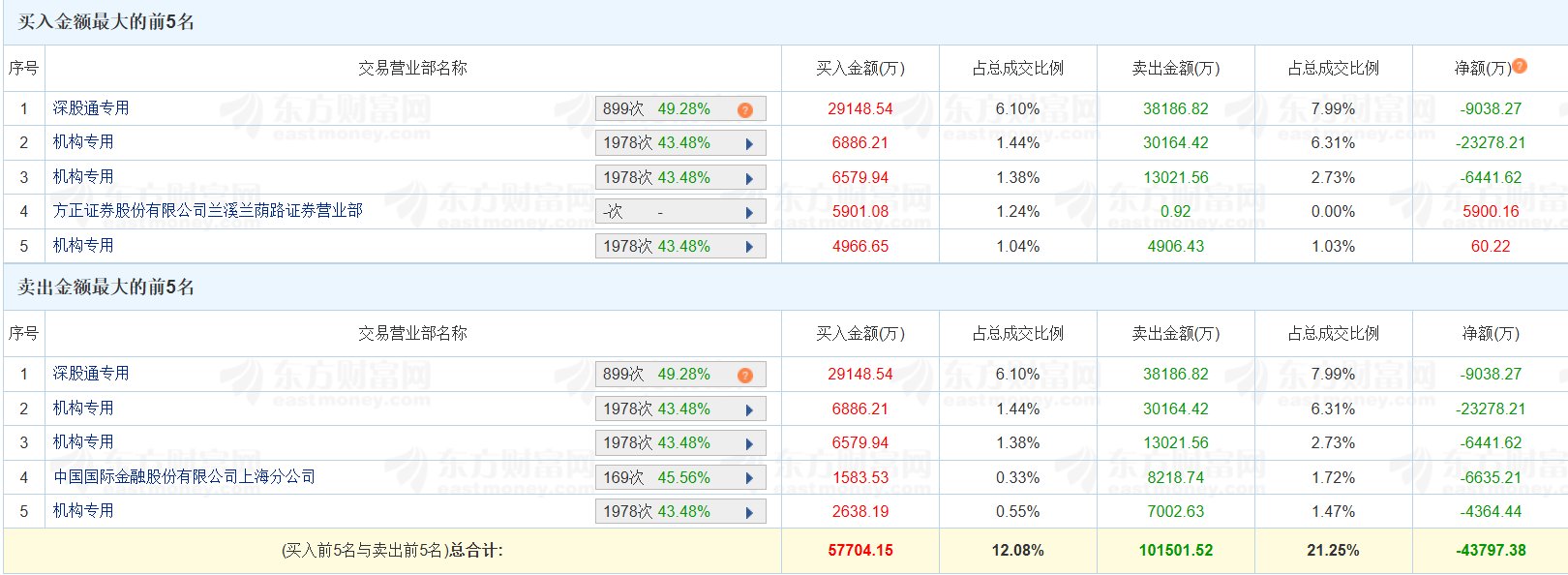 | | 买入金额最大的前5名 | | | | | | | --- | --- | --- | --- | --- | --- | --- | | 序号 | | 交易营业部名称 | | | 买入金额(万) | 占总成交比例 | | 1 | 深股通专用 | | 899次 49.28% | 2 | 29148.54 | 6.10% | | 2 | 机构专用 | | 1978次 43.48% | A | 6886.21 | 1.44% | | 3 | 机构专用 | | 1978次 43.48% | A | 6579.94 | 1.38% | | 4 | 方正证券股份有限公司兰溪兰荫路证券营业部 | | 次 - | A | 5901.08 | 1.24% | | 5 | 机构专用 | | 1978次 43.48% | ▶ | 4966.65 | 1.04% | | | 卖出金额最大的前5名 | | | | | | | 序号 | | 交易营业部名称 | | | 买入金额(万) | 占总成交比例 | | 1 | 深股通专用 | | 899次 49.28% | 2 | 29148.54 | 6.10% | | 2 | 机构专 ...