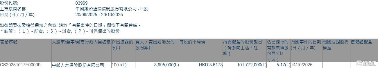 格隆汇10月20日丨根据联交所最新权益披露资料显示,2025年10月14日,中国通号(03969.HK)获中邮人寿保险股份有限公司在场内以每股均价3.6173港元增 持399.5万股,涉资约1445.11万港元。 | 帳格序號 | 大股東/董事/最高行政人員名稱 作出披露的 買入 / 賣出或涉及的 每股的平均價 | | | | | 持有權益的股份數目 佔已發行的 有關事件的日期 | | | --- | --- | --- | --- | --- | --- | --- | --- | | | | 原因 | 股份數目 | | | (請參閱上述*註 | 有投票權股 (日 / 月 / 年) | | | | | | | | | 份百分比 | | | | | | | | | (%) | | CS20251017E00009 | 中邮人寿保险股份有限公司 | 1001(L) | | 3,995,000(L) | HKD 3.6173 | 101,772,000(L) | 5.17(L)14/10/2025 | | 股份代號: | 03969 | | --- | --- | | 上市法國名稱: | 中國鐵路通信信號股份有限 ...