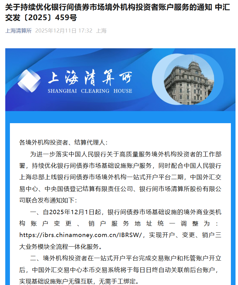 12月11日金融一线消息,上海清算所今日发布关于持续优化银行间债券市场境外机构投资者账户服务的通 知。通知指出,为进一步落实中国人民银行关于高质量服务境外机构投资者的工作部署,持续优化银行间债 券市场基础设施账户服务,同时配合中国人民银行上海总部上线银行间债券市场境外机构一站式开户平台二 期,中国外汇交易中心、中央国债登记结算有限责任公司、银行间市场清算所股份有限公司联合发布通知如 下: 一、自2025年12月1日起,银行间债券市场基础设施的境外商业类机构账户变更、销户服务地址统一调整为: https://ibrs.chinamoney.com.cn/IBRSW/,实现开户、变更、销户三大业务模块全流程一体化服务。 二、境外机构投资者在一站式开户平台完成交易账户和托管账户开立后,中国外汇交易中心本币交易系统将 于每日日终自动关联前后台账户,实现基础设施账户无缝互联,无需手工绑定。 责任编辑:曹睿潼 12月11日金融一线消息,上海清算所今日发布关于持续优化银行间债券市场境外机构投资者账户服务的通 知。通知指出,为进一步落实中国人民银行关于高质量服务境外机构投资者的工作部署,持续优化银行间债 券市场基础设施账户服 ...