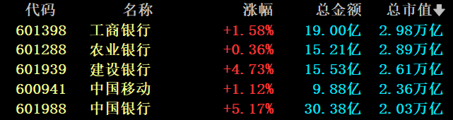 | 代码 | 名称 | 涨幅 | 总金额 总市值量 | | --- | --- | --- | --- | | 601398 工商银行 | | +1. 58% | 19.00亿 2.98万亿 | | 601288 | 农业银行 | +0. 36% | 15.21亿 2.89万亿 | | 601939 | 建设银行 | +4.73% | 15.53亿 2.61万亿 | | 600941 | 中国移动 | +1. 12% | 9.88亿 2.36万亿 | | 601988 中国银行 | | +5.17% | 30.38亿 2.03万亿 | 截至上午收盘,上证指数上涨0.38%,深证成指下跌0.05%,创业板指下跌0.52%。市场半日成交额超1.11万亿元。 银行板块大涨 今天上午,银行板块继续走强,板块内个股全部上涨,中国银行、建设银行、邮储银行等个股涨幅居前。 中金公司(601995)拟换股吸收合并东兴证券、信达证券(601059),英伟达第三财季业绩以及第四财季业绩指引均超市场预期,碳酸锂期货主力合约突 破10万元/吨…… 这是盘前市场关注度较高的几个消息。不过,A股上午开盘后,市场讨论最多的是中国银行(60 ...