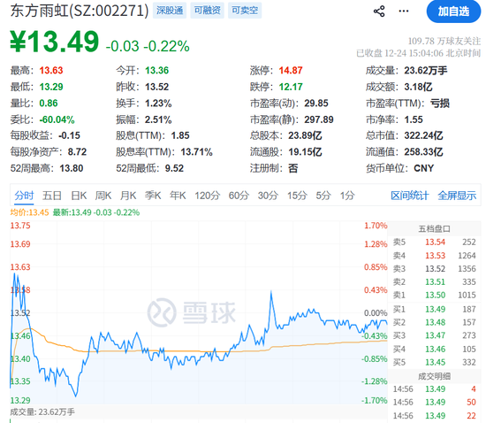 炒股就看金麒麟分析师研报,权威,专业,及时,全面,助您挖掘潜力主题机会! 来源:财通社 公告发出后,今天上午东方雨虹股价一度下跌1.7%。截至下午A股收盘,东方雨虹股价报13.49元/股, 微跌0.22%,总市值322.24亿元。 | 最高:13.63 | 今开:13.36 | 涨停:14.87 | 成交量:23.62万手 | | --- | --- | --- | --- | | 最低:13.29 | 昨收:13.52 | 跌停:12.17 | 成交额:3.18亿 | | 量比:0.86 | 换手:1.23% | 市盈率(动):29.85 | 市盈率(TTM): 亏损 | | 委比:-60.04% | 振幅:2.51% | 市盈率(静): 297.89 | 市净率:1.55 | | 每股收益:-0.15 | 股息(TTM): 1.85 | 总股本:23.89亿 | 总市值:322.24亿 | | 每股净资产:8.72 | 股息率(TTM):13.71% | 流通股:19.15亿 | 流通值:258.33亿 | | 52周最高:13.80 | 52周最低: 9.52 | 注册制: 좀 | 货币单位:CNY | ...