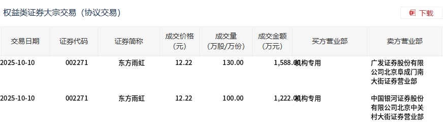 10月10日,东方雨虹大宗交易成交230万股,成交额2810.6万元,占当日总成交额的3.15%,成交价12.22元,较市场收盘价 12.86元折价4.98%。 | 交易日期 | 证券代码 | 证券简称 | 成交价格 (元) | 成交軍 | 成交全额 (万元) | 买方营业部 | 卖方营业部 | | --- | --- | --- | --- | --- | --- | --- | --- | | | | | | (万股/万份) | | | | | 2025-10-10 | 002271 | 东方雨虹 | 12.22 | 130.00 | 1,588. 枫构专用 | | 广发证券股份有限 | | | | | | | | | 公司北京阜成门南 | | | | | | | | | 大街证券营业部 | | 2025-10-10 | 002271 | 东方雨虹 | 12.22 | 100.00 | 1,222. 枫构专用 | | 中国银河证券股份 | | | | | | | | | 有限公司北京中关 | | | | | | | | | 村大街证券营业部 | ...